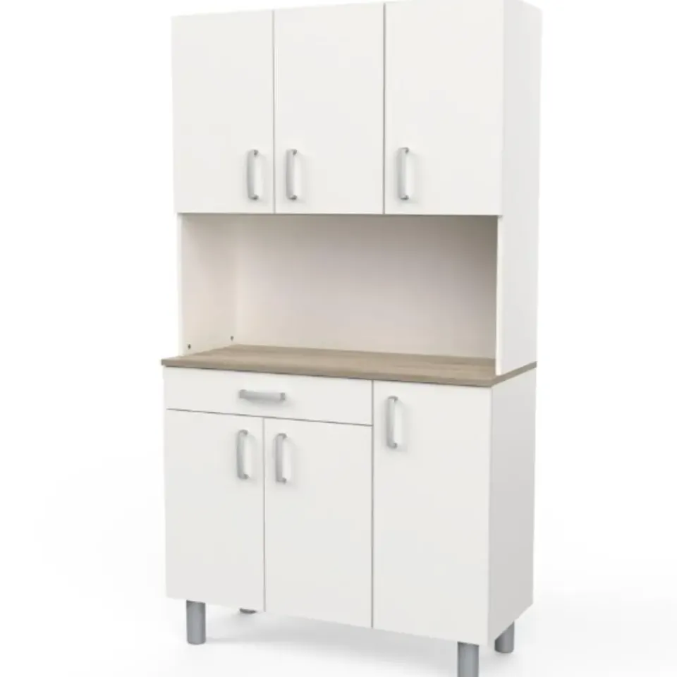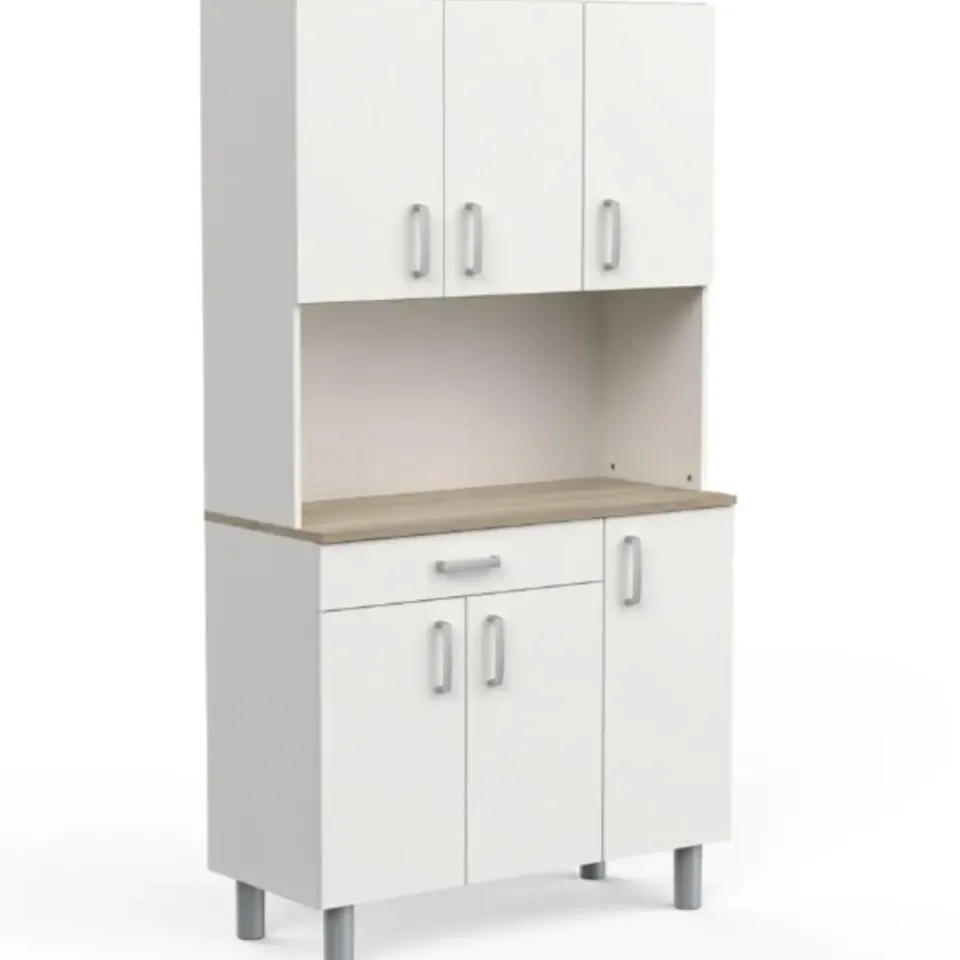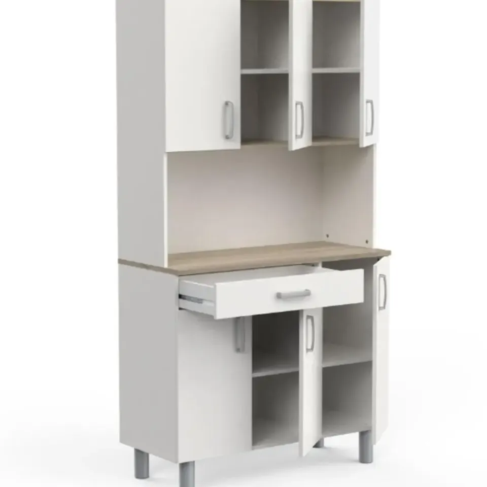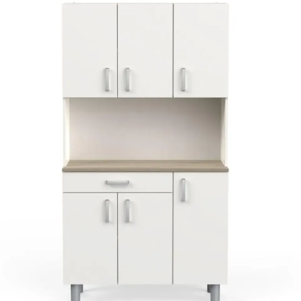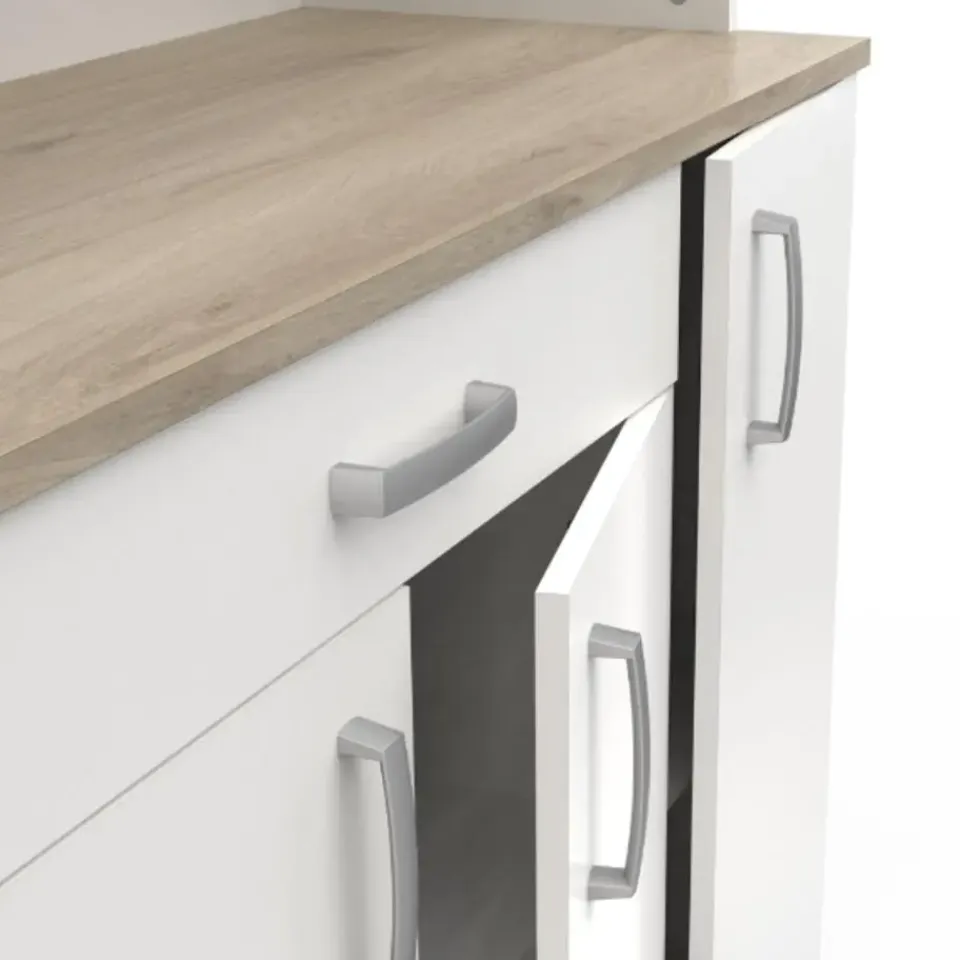 Deze neutrale buffetkast kan gemakkelijk geïntegreerd worden in bijna elk interieur. Het werkblad in Kronberg eikdecor geeft het meubel een mooi natuuraccent. Achter de 4 draaideuren is er veel opbergruimte voorzien voor uw servies en voorraad. De handige lade biedt plaats aan uw bestek. Het open vak kunt u vrijlaten om als werkblad te gebruiken of u kunt er allerhande keukenapparatuur zoals een microgolfoven of koffiemachine in plaatsen. Houd uw keuken gemakkelijk opgeruimd met buffetkast Gabe.
