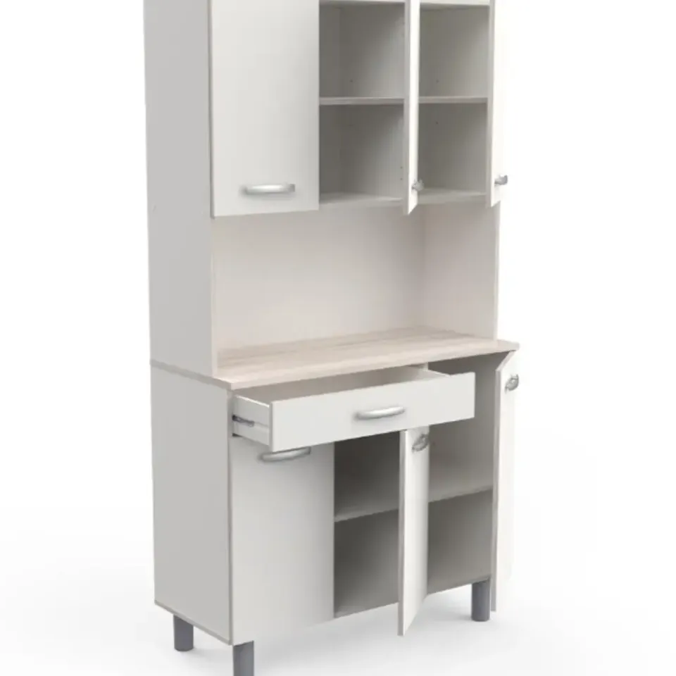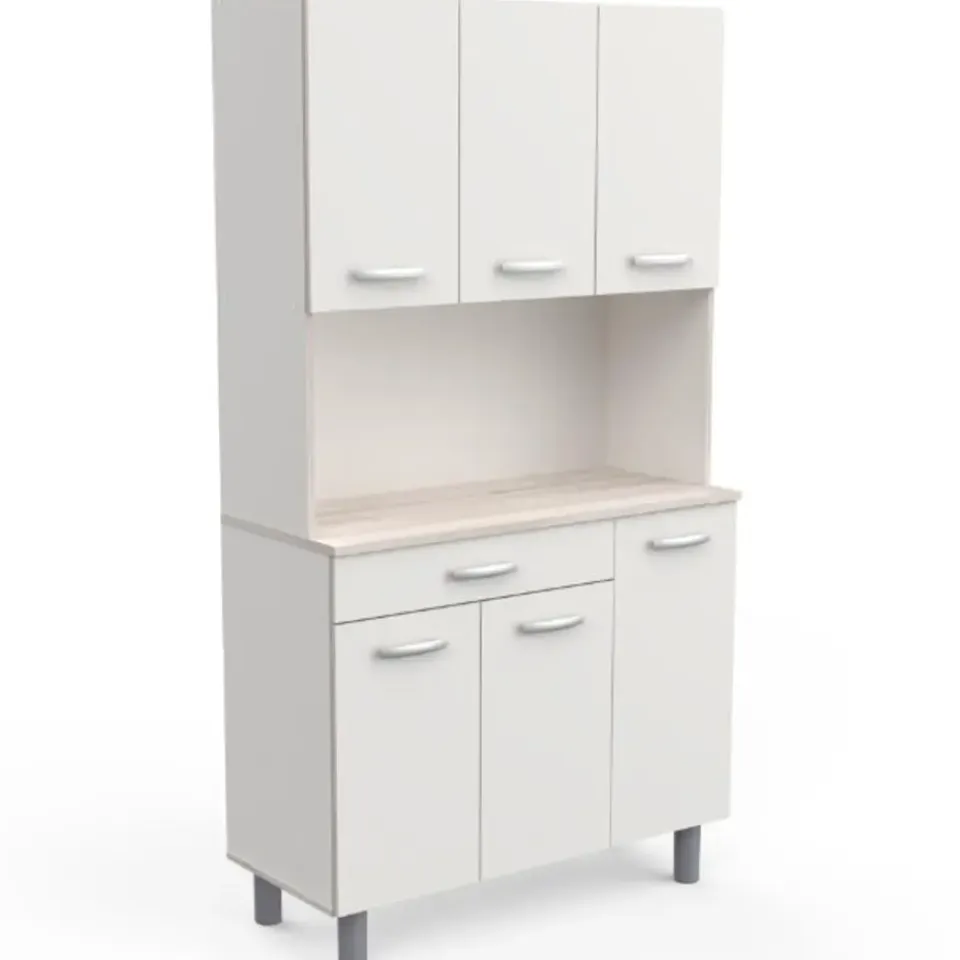 Het neutrale ontwerp van deze buffetkast maakt dat hij gemakkelijk geïntegreerd kan worden in bijna elk interieur. De kast krijgt karakter door het werkblad in prachtig acaciadecor. Deze ruime buffetkast heeft een lade voor uw bestek en 6 draaideuren met daarachter opbergruimte voor uw servies, kookpotten, voorraad en keukengerei. In het open vak kan een microgolfoven, koffiemachine of andere keukenapparatuur geplaatst worden. Buffetkast Pavel is een veelzijdige uitbreiding voor uw keuken! Schroeven en pluggen voor wandmontage zijn niet inbegrepen.