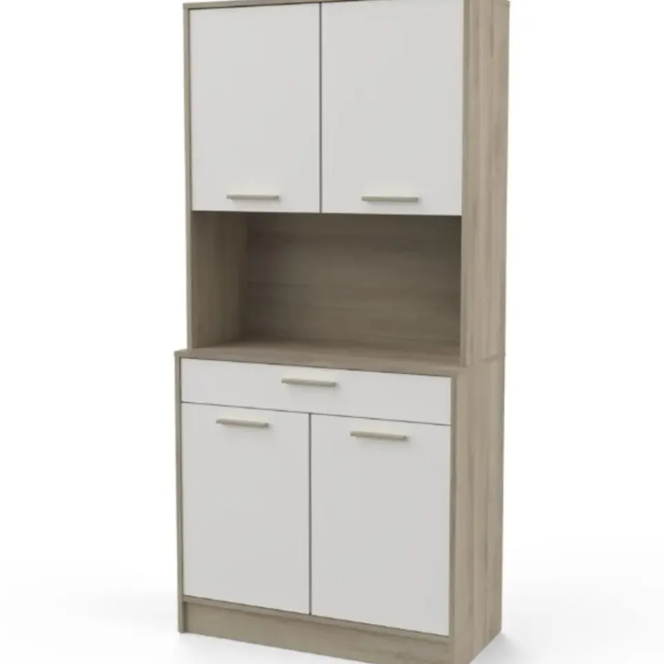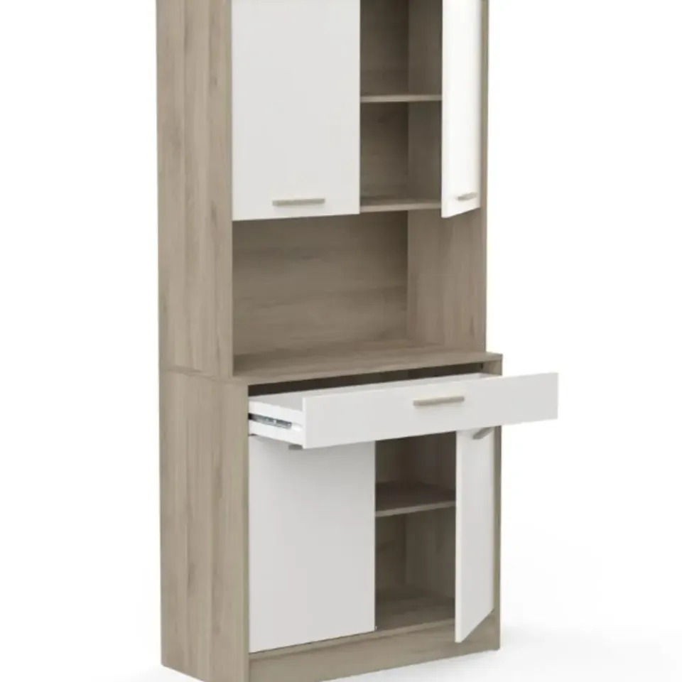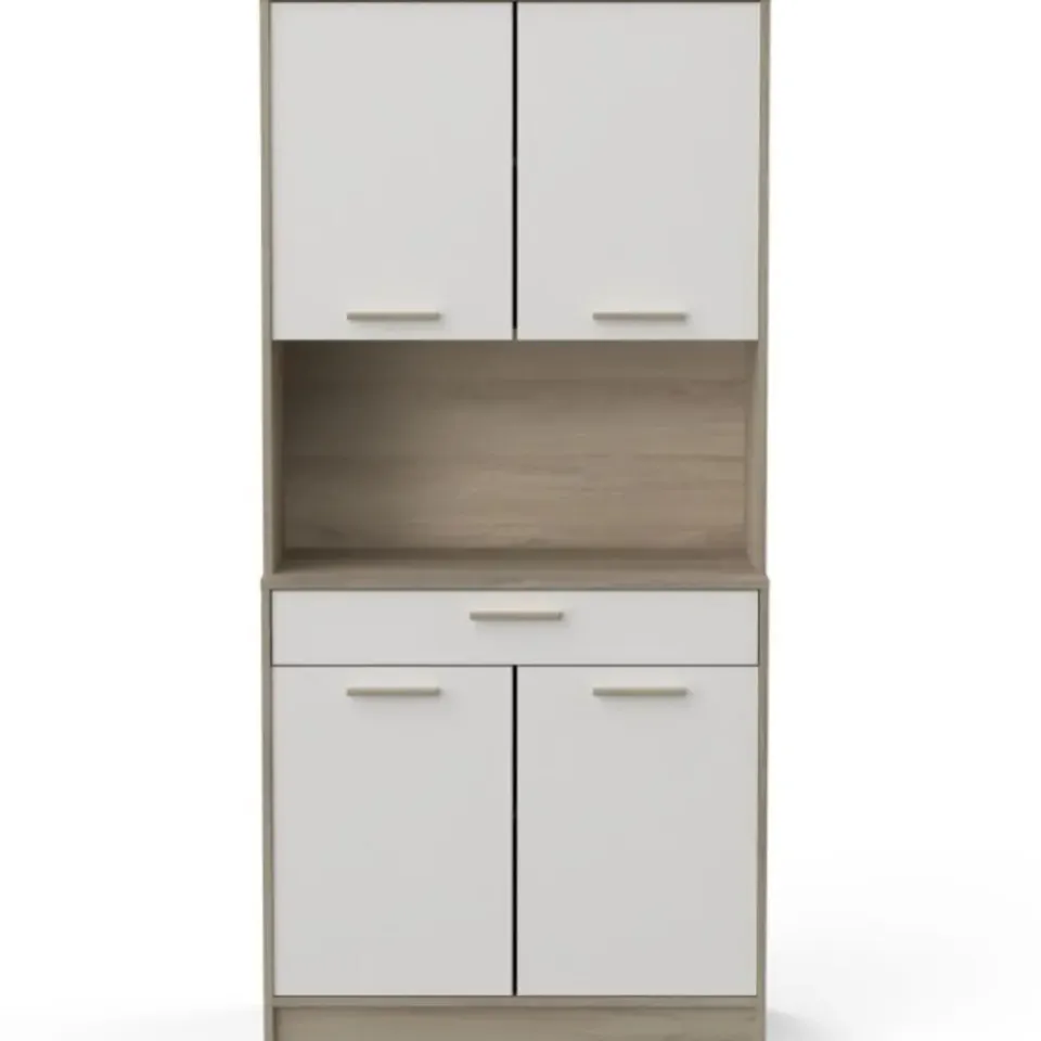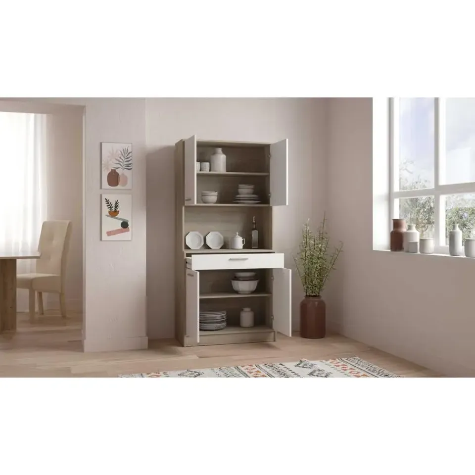 De combinatie van het strakke mat wit en het lichte kronberg eikdecor van buffetkast Romanie is een echte voltreffer. Deze kast beschikt over een lade voor uw bestek en 4 draaideuren met daarachter 2 legplanken voor allerhande keukengerei, kruiden, etc. In het open vak is er plaats voor eventueel een microgolfoven of andere keukenapparaten. Deze kast kan tegen de muur gemonteerd worden, de schroeven en pluggen hiervoor dient u zelf te voorzien.