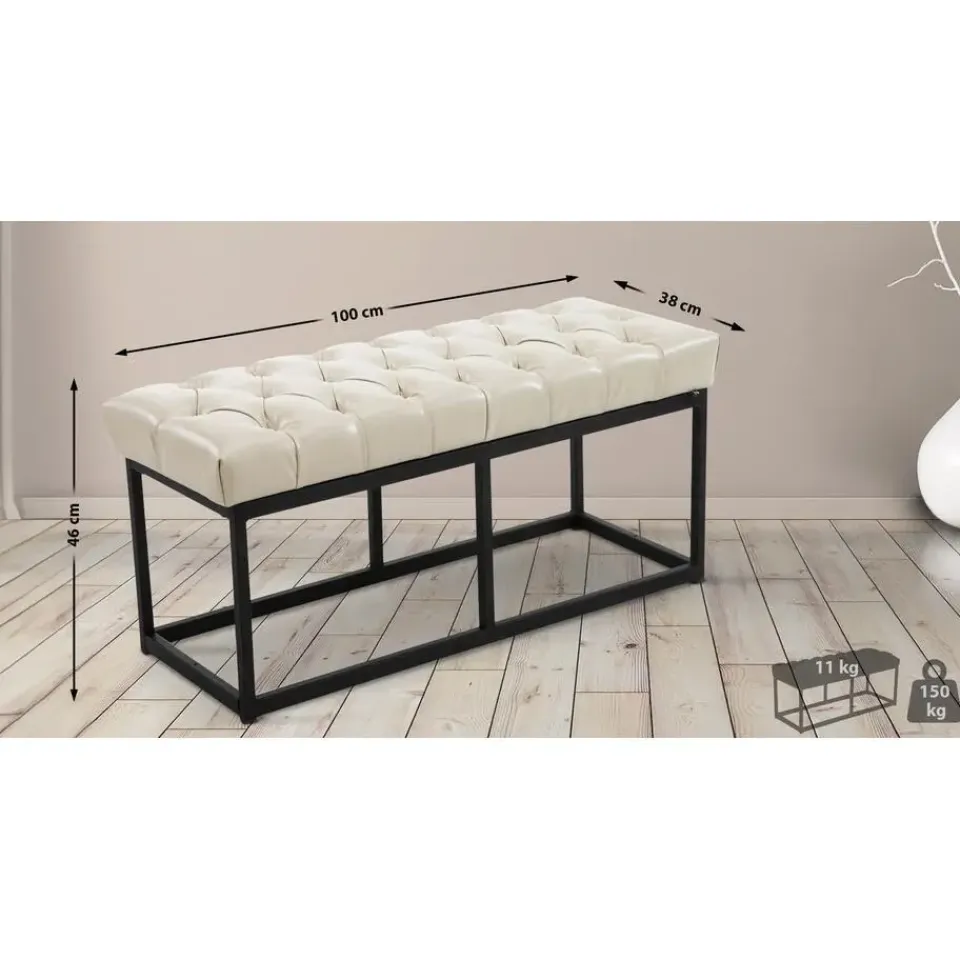 De gewatteerde bekleding is bedekt met gemakkelijk te onderhouden en duurzaam kunstleer. De gestoffeerde bank integreert flexibel en mooi in elke ruimte, of het nu in de woonkamer, hal, eetkamer of slaapkamer is.