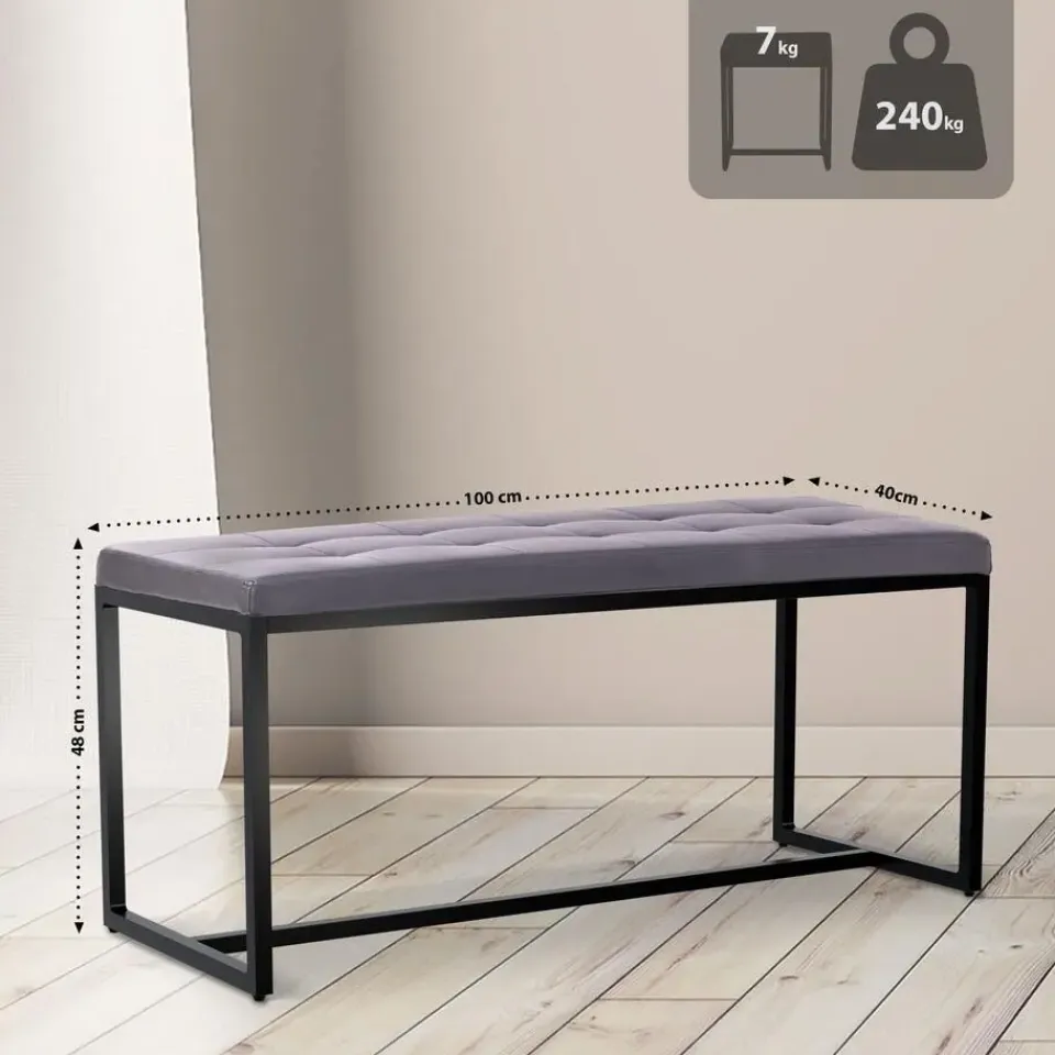Details:Totale breedte: 100 cmTotale hoogte: 48 cmTotale diepte: 40 cmZithoogte: 48 cmZitoppervlak (B x D): 100 x 40 cmMaximale belastbaarheid: 240 kgGewicht: 7 kgMateriaalsamenstelling: 100% polyester (stof en fluweel) / 100% polyurethaan (kunstleer)