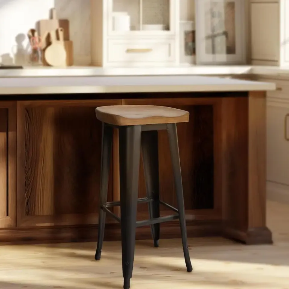 De barkruk Clara maakt indruk met een uiterst stijlvolle combinatie van massief hout en mat zwart metaal, waardoor een rustiek-moderne uitstraling ontstaat.