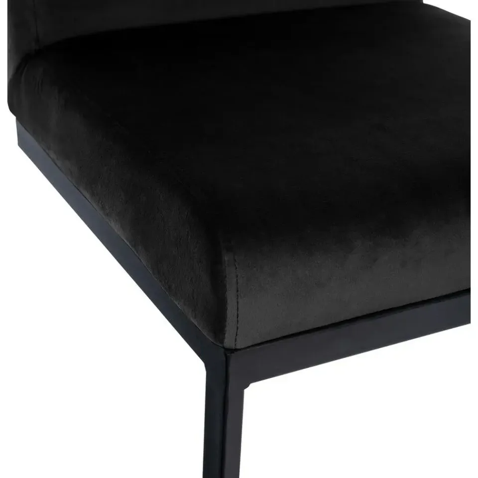 Het lineaire frame van gepoedercoat metaal zorgt voor een geweldige blikvanger en het lichte schommelen van de zitting wordt als zeer prettig ervaren. Een geïntegreerde dwarsbalk dient als comfortabele voetensteun, terwijl de rugleuning op de zitting de onderrug ondersteunt. De zitting en rugleuning zijn royaal gestoffeerd en afgewerkt met een chique fluwelen bekleding.