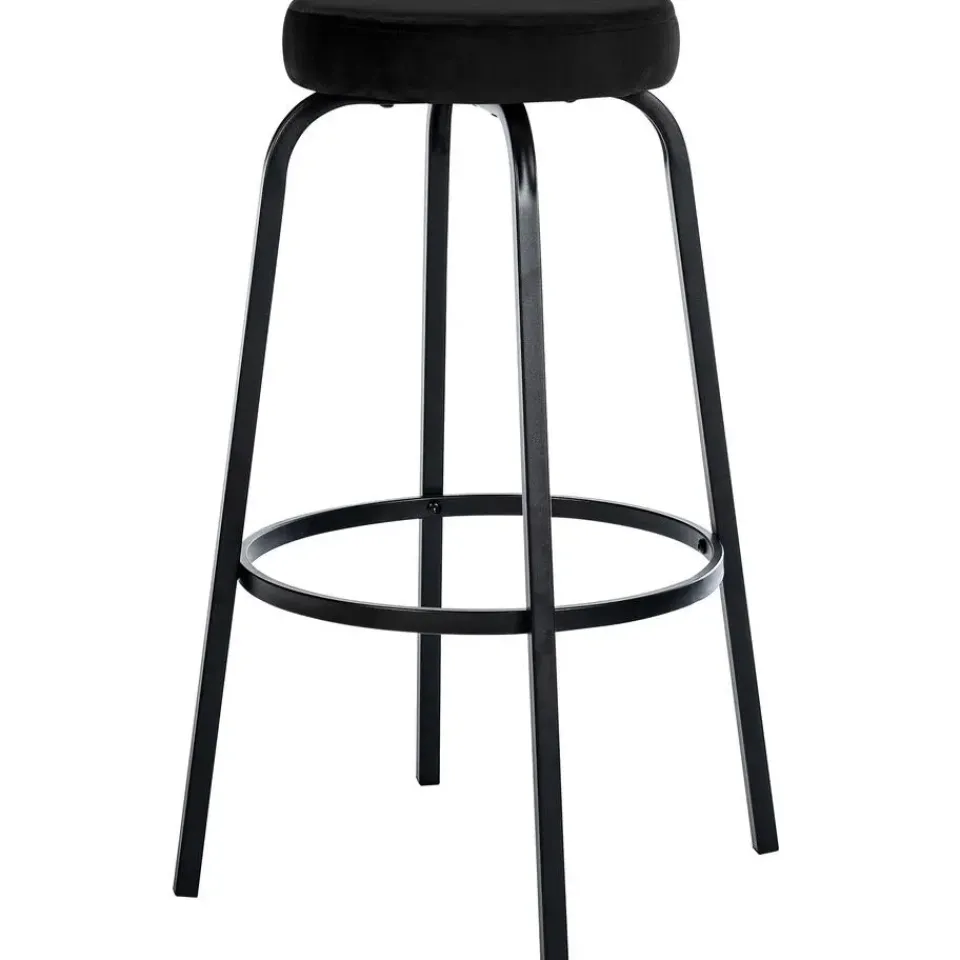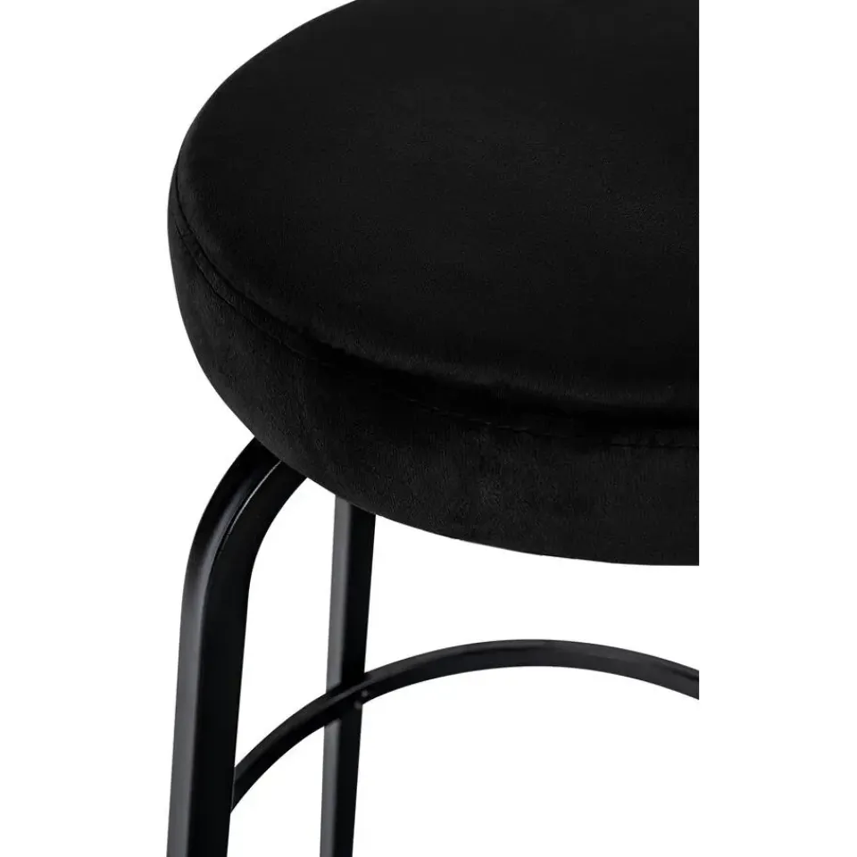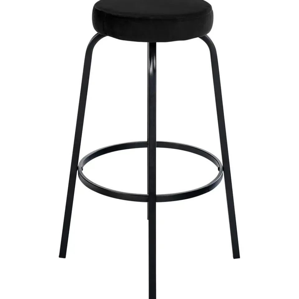 De Kamari barkruk maakt indruk met zijn tijdloze combinatie van een ronde gestoffeerde zitting en een matzwart metalen onderstel met vier poten.