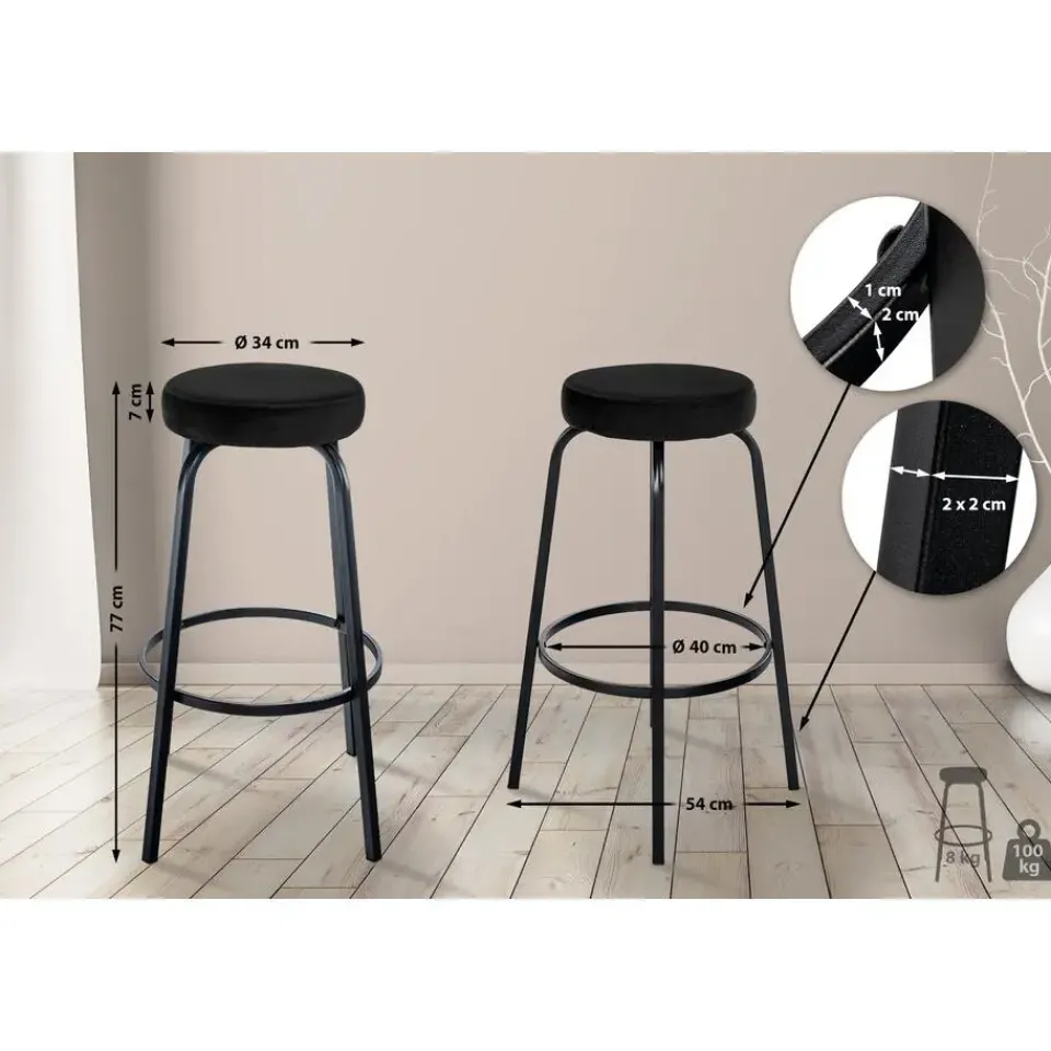 Details:Totale hoogte: 78 cmTotale breedte: 41 cmTotale diepte: 41 cmZithoogte: 78 cmZittingoppervlak: Ø 34 cmGewicht: 8 kgMateriaalsamenstelling: 100% polyester (fluweel), 100% polyurethaan (kunstleer)