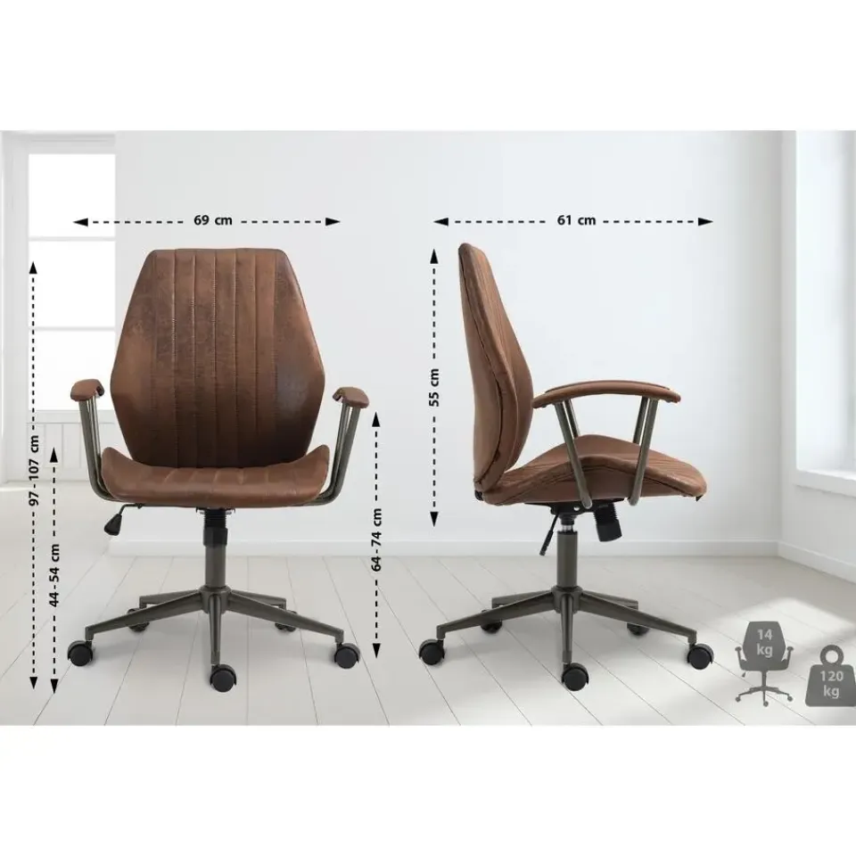 De exclusieve bureaustoel Nampa maakt niet alleen indruk met zijn opvallende industriële look, maar is ook ongeëvenaard op het gebied van comfort. De slijtvaste kunstlederen bekleding en de hoogwaardige stoffering zorgen voor een aangename zitervaring gedurende meerdere uren. De rugleuning heeft een aangename S-vorm en de zithoogte is traploos verstelbaar en garandeert ergonomisch zitten. De bureaustoel is ook uitgerust met een schommelmechanisme dat voor meer bewegingsvrijheid zorgt. De stabiliteit wordt gegarandeerd door het zwarte metalen frame. Dankzij de vijf soepel lopende wielen rolt de stoel gemakkelijk over de vloer – zowel op harde vloeren als op tapijt.