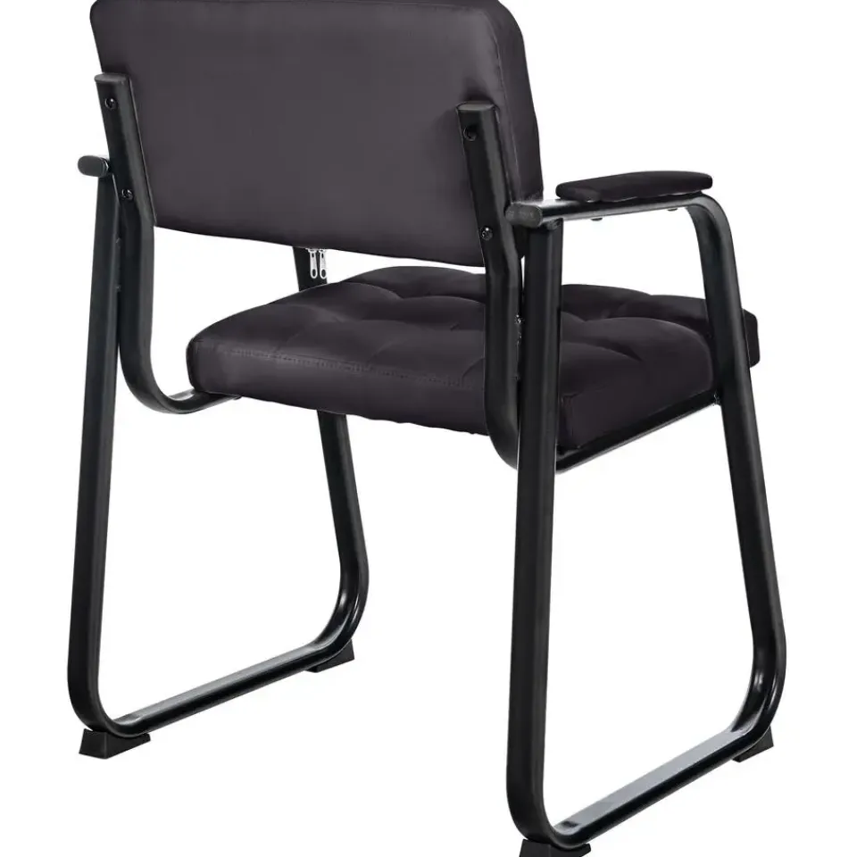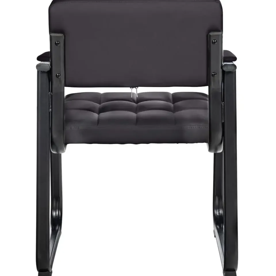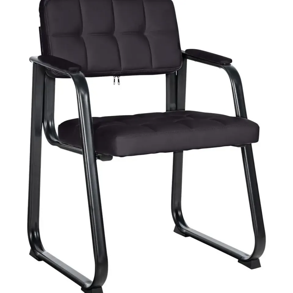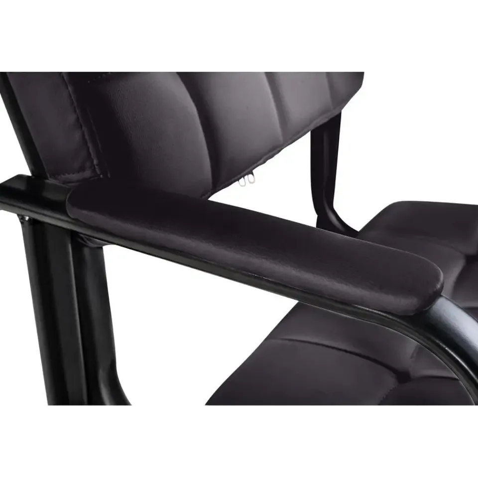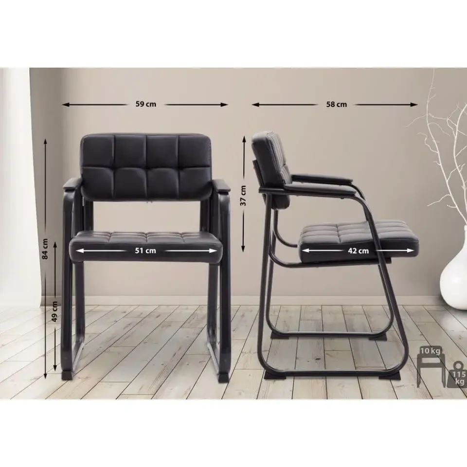 Deze eetkamersstoel geeft elke kamer een exclusieve uitstraling. De comfortabele vergaderstoel fascineert niet alleen met zijn uitstekende ziteigenschappen, maar ook met zijn buitengewone ontwerp. Het uiterlijk wordt bepaald door de gewatteerde bekleding met kunstlederen overtrek en het gebogen frame. Door de bekleding van de zitting en rugleuning kunt u uren comfortabel doorbrengen. Deze bezoekersstoel staat op een stevig frame van zwart gelakt metaal, dat is voorzien van vloerbeschermers. Deze fauteuil past harmonieus in elk interieur, hij is ideaal voor wachtkamers, beurzen en andere evenementen.