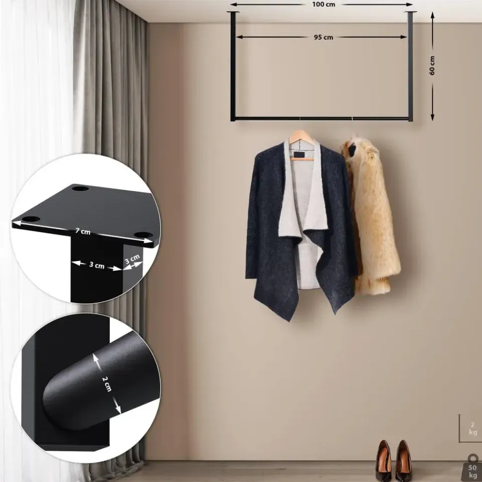 De kledingroede is gemaakt van gepoedercoat staal en is robuust en veerkrachtig, met een draagvermogen tot 50 kilo. De kledingroede is snel en eenvoudig te monteren. Duidelijke montage-instructies en alle benodigde onderdelen worden meegeleverd.