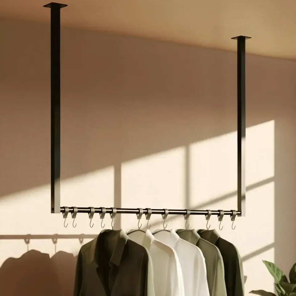De plafondbevestiging is een speciale functie, die ook veel combinatiemogelijkheden biedt. De hanger kan bijvoorbeeld worden gecombineerd met een ladekast, een dressoir of een schoenenrek. Met genoeg ruimte voor jassen, shirts en blouses houdt deze open kledingroede kleding kreukvrij en altijd binnen handbereik.
