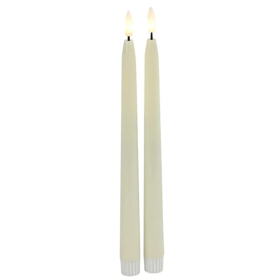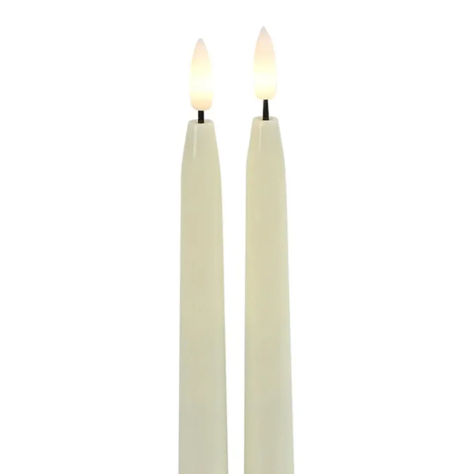 LED dinerkaarsen in de kleur beige/creme wit uit de Elegance serie van het merk Countryfield. De LED kaarsen/dinerkaarsen in de kleur beige wit wit zijn gemaakt van hoogwaardig materiaal en hebben een lengte van ongeveer 28 cm. Met de meegeleverde afstandsbediening kun je de timer instellen. De kaarsen zijn per 2x stuks verpakt en zijn veilig te gebruiken omdat ze geen echte vlam hebben. De kaarsen hebben een diameter van 2,2 cm. Voeding afstandsbediening: CR2025 knoopcel batterij (inbegrepen) en voeding per kaars: 2 AAA batterijen (niet inbegrepen). Materiaal: polystone.