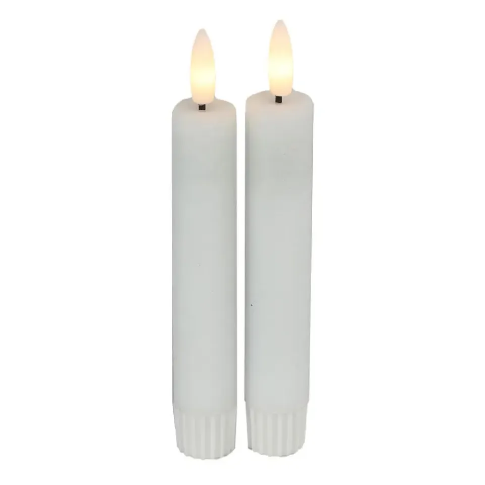 LED dinerkaarsen. Deze LED kaarsen/dinerkaarsen zijn gemaakt van hoogwaardig materiaal met een wite afwerking en hebben een hoogte van 15 cm. Met de meegeleverde afstandsbediening kun je de timer en dimmer instellen voor het perfecte licht. De kaarsen zijn per 2x stuks verpakt en zijn veilig te gebruiken, omdat ze geen echte vlam hebben. De kaarsen hebben een diameter van 2 cm. Voeding afstandsbediening: CR2025 knoopcel batterij (inbegrepen) en voeding per kaars: 1x AA batterij (niet inbegrepen).