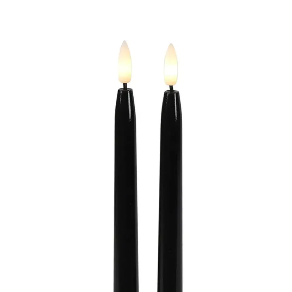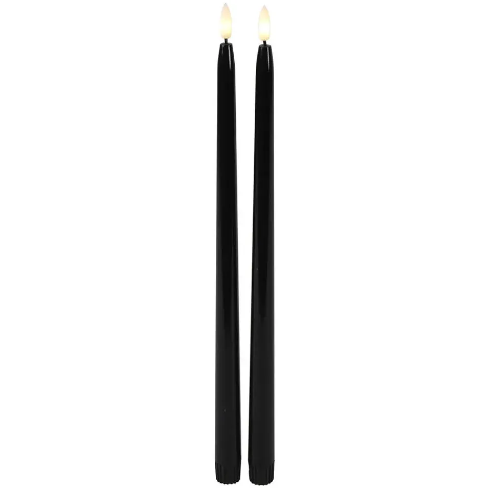 Extra lange LED dinerkaarsen uit de Elegance serie van het merk Countryfield. De LED kaarsen/dinerkaarsen in de kleur zwart zijn gemaakt van hoogwaardig materiaal en hebben een extra lange lengte van ongeveer 38 cm. Met de meegeleverde afstandsbediening kun je de timer instellen. De kaarsen zijn per 2x stuks verpakt en zijn veilig te gebruiken omdat ze geen echte vlam hebben. De kaarsen hebben een diameter van 2,2 cm. Voeding afstandsbediening: CR2025 knoopcel batterij (inbegrepen) en voeding per kaars: 2 AAA batterijen (niet inbegrepen). Materiaal: polystone.