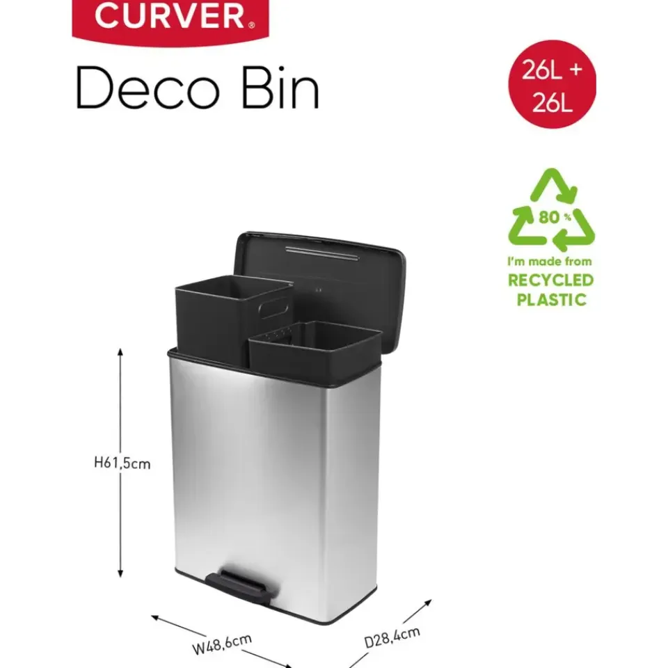 Beschikbaar in een brede range aan maten en vormen is er voor elke gezinsgrootte en persoonlijke smaak wel iets. Deze rechthoekige prullenbak is een comfortabel recycling systeem. Het heeft twee binnenemmers met elk een inhoud van 26 liter. Daarnaast kan de bak ook als 65L afvalbak dienen wanneer de twee binnenemmers verwijderd worden. Naast dat deze pedaalemmer gemaakt is van gerecycled kunststof is hij niet enkel duurzaam, maar ook erg functioneel met zijn soft close mechanisme waardoor het deksel geruisloos sluit en een comfortabel pedaal, waardoor de prullenbak hygienisch en gemakkelijk in gebruik is. Deze prullenbak komt met een garantie van 5 jaar die staat voor kwaliteit en duurzaamheid.
