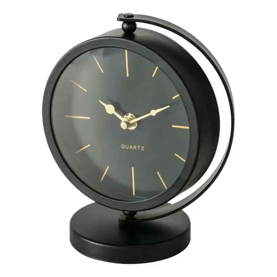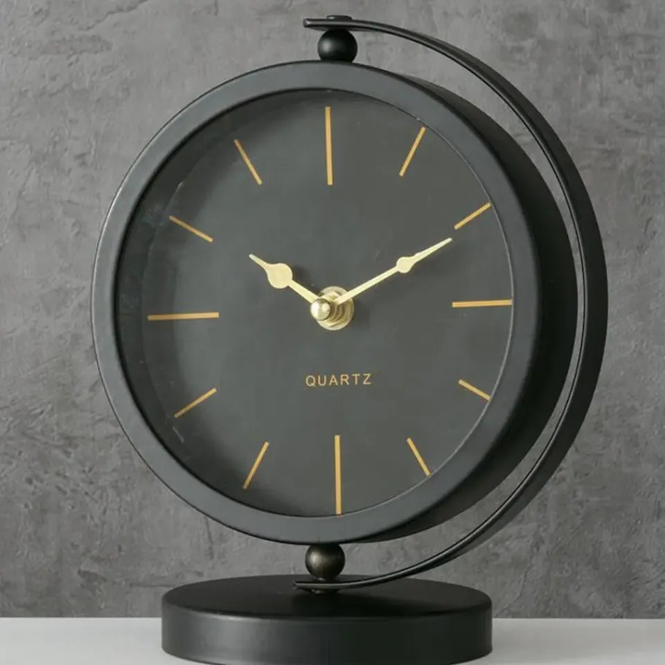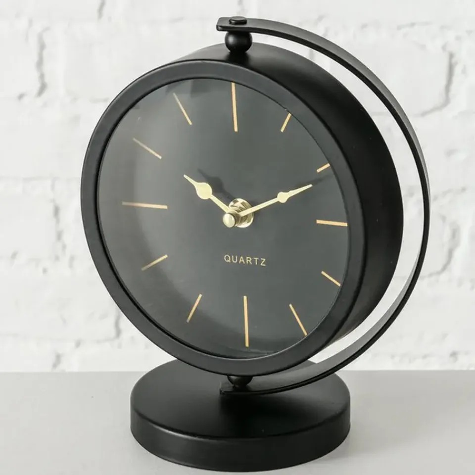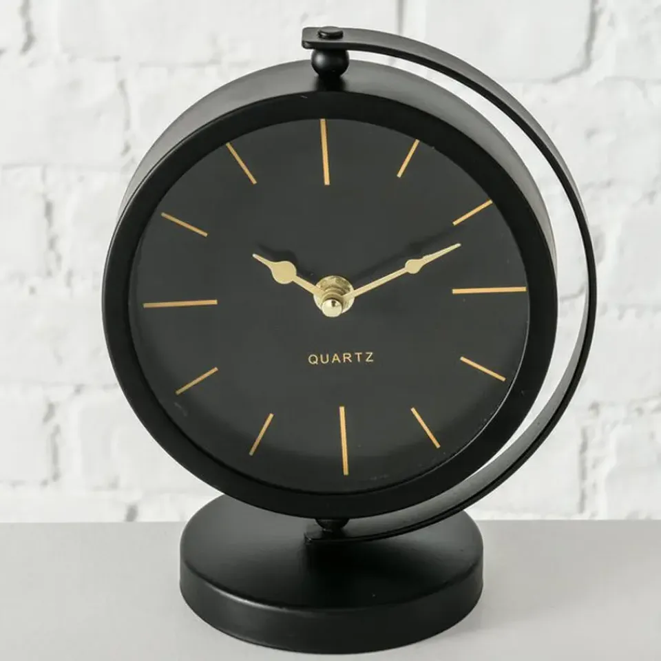 Tafelklok staand model Montreux gemaakt van metaal en glas. Kleur: zwart/goud. Afmetingen ongeveer: 20 x 15 cm, de dia van de klok is ongeveer 15 cm. Aantal benodigde batterijen: 1x AA, niet inbegrepen. Staande klokken voor in de woonkamer, kantoor of slaapkamer. Luxe uitstraling. Moderne look. Een absolute verrijking van uw kantoor of huis interieur. Draaibaar midden stuk.
