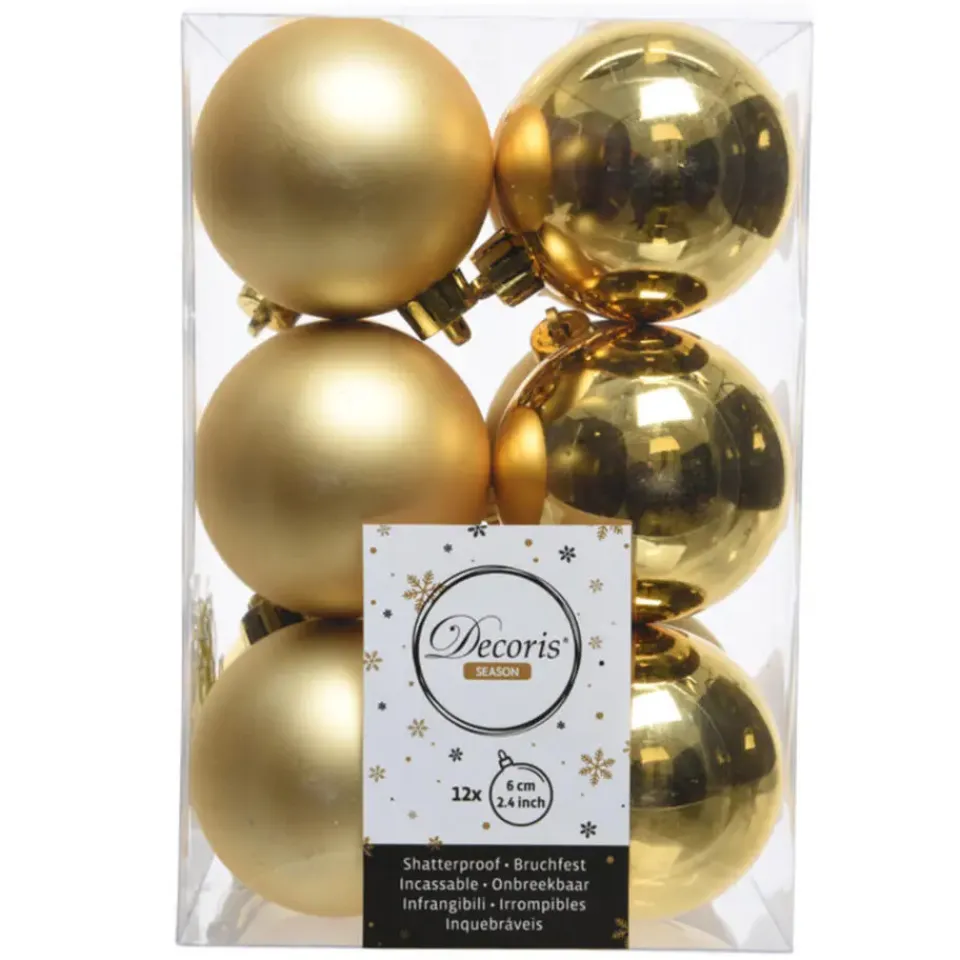 Decoris Kerstballen in de kleur goud. Verrijk je kerstversiering met deze prachtige set van 12x stuks kerstballen in een elegante goudkleurige afwerking. Elke bal heeft een diameter van 6 cm en biedt een mix van matte en glanzende oppervlakken voor een verfijnde en veelzijdige decoratie van je kerstboom, kerstkrans of andere feestelijke arrangementen. De warme goudkleur voegt een klassiek en feestelijk element toe aan je kerstdecoratie.
