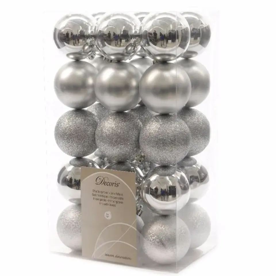 Kerstballen in de kleur zilver. Breng sprankeling in je kerstboom met deze set van 30x stuks kerstballen van Decoris. Deze onbreekbare kerstballen set bevat een mooie mix van afwerkingen, perfect voor een levendige en elegante kerstboom. Met een diameter van 6 cm omvat de set een mix van afwerkingen: glans, mat en glitter.