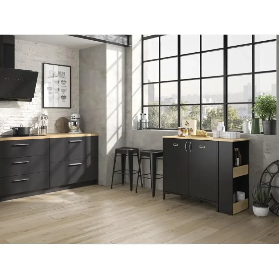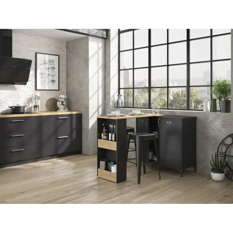De draaibare bar tafel met 2 deuren MANCHESTER is een kwaliteitsmeubel gemaakt in Frankrijk. Het draaibare tafelblad biedt twee open opbergzones, perfect voor het opbergen van flessen of andere dagelijkse voorwerpen. De grote gesloten opbergruimte is verdeeld in vier zones met in hoogte verstelbare planken voor een gepersonaliseerde organisatie. De twee metalen labeldeuren voegen een industriële touch toe aan het geheel, terwijl de zwarte en eiken bi-tone een uitgesproken stijl geeft.