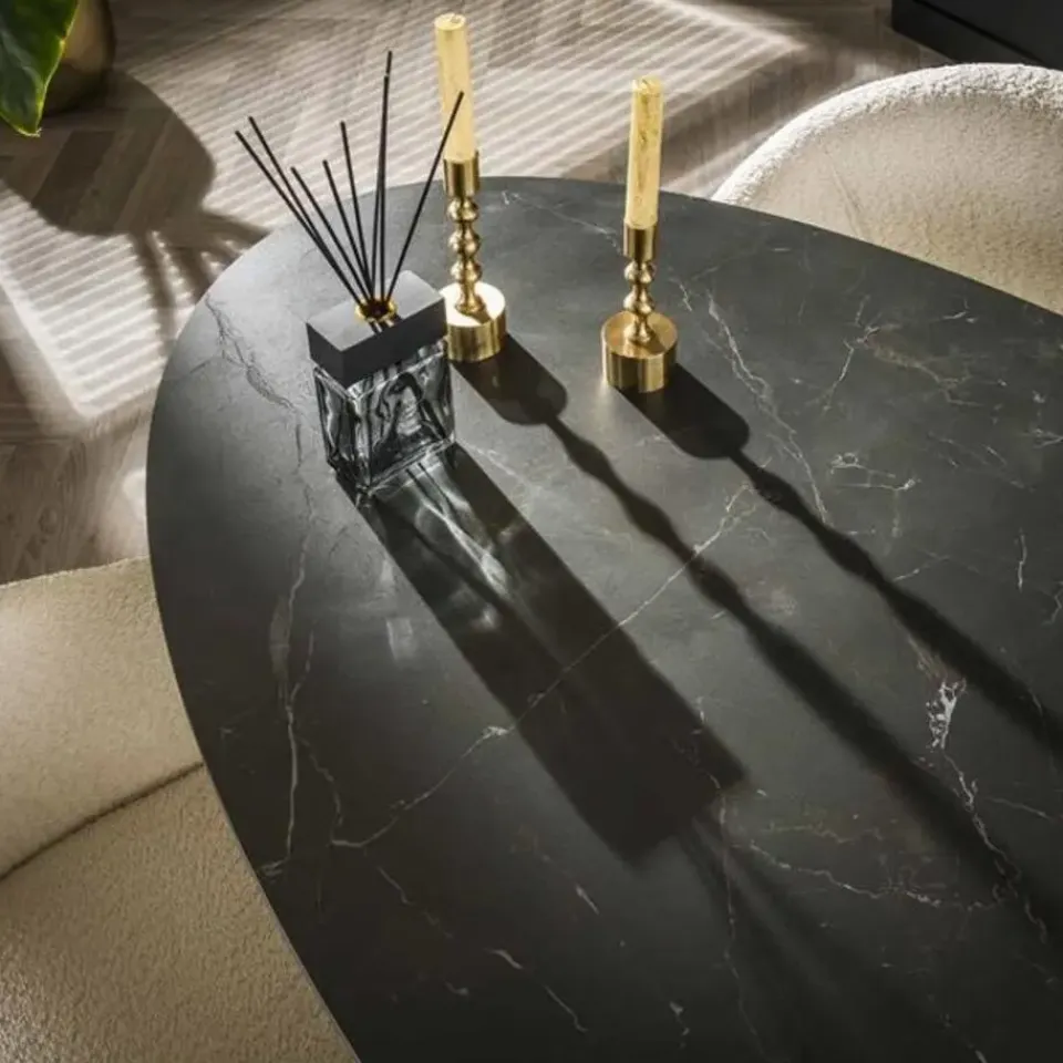 Het ovale tafelblad is gemaakt van stevig keramiek. Keramiek is bestand tegen vlekken en heel gemakkelijk schoon te maken. Gemorste vloeistoffen kunnen gewoon met een doek worden weggeveegd. Perfect voor een huishouden met kinderen.