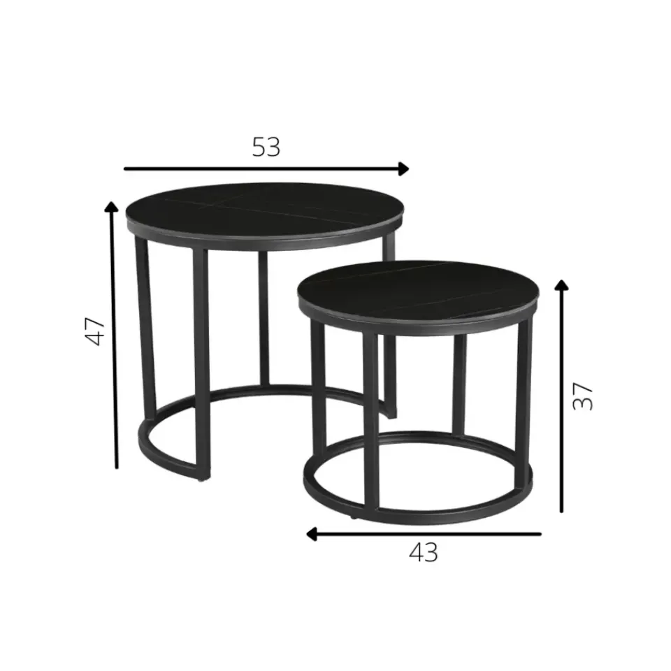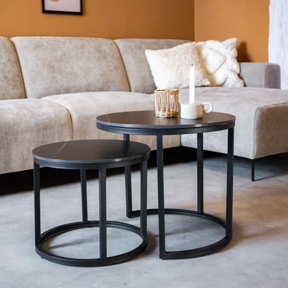 Het framewerk van salontafel set Paige is gemaakt van zwart gepoedercoat metaal. De tafeltjes worden gemonteerd geleverd waardoor je na ontvangst de set alleen maar hoeft uit te pakken en op de juiste plek hoeft te zetten.
