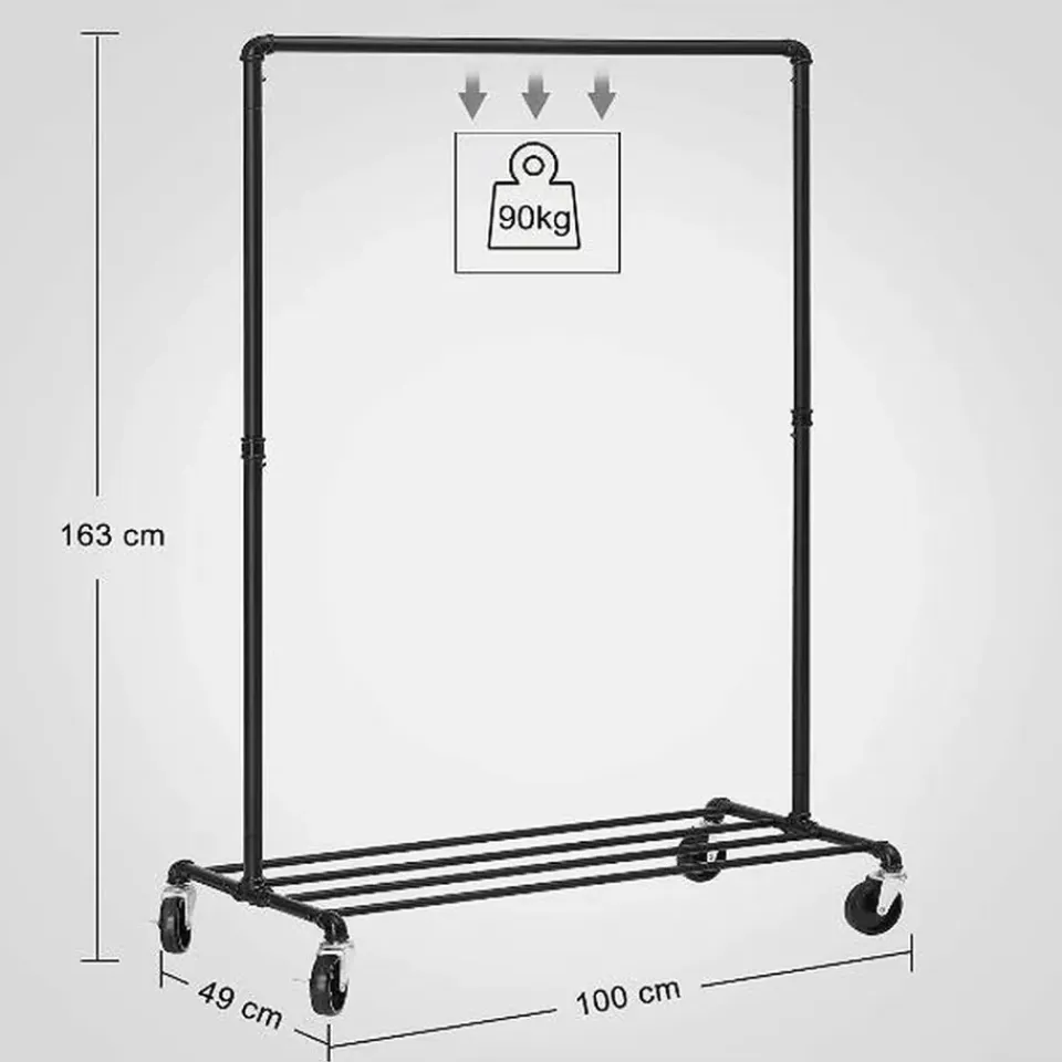 Metalen buizen zorgen voor optimale sterkte en stabiliteit, waardoor deze hanger tot 90 kg kan dragen. Wielen aan de onderkant zorgen ervoor dat dit meubel soepel kan bewegen. Vergrendelbare remmen zorgen ervoor dat het rek stabiel blijft staan en dankzij de industriële stijl past dit meubel gegarandeerd in elk interieur.