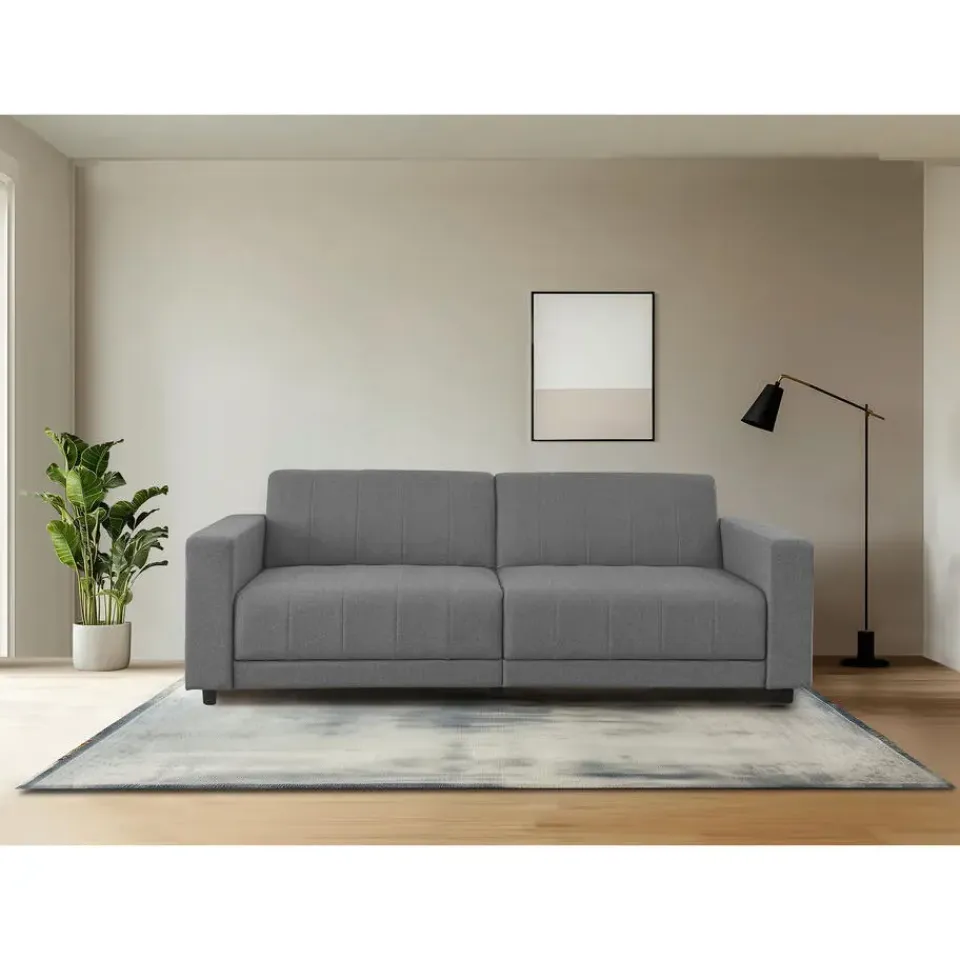 De elegante slaapbank met drie zitplaatsen, bekleed met luxueuze zachte stof, is perfect voor elke woonkamer, logeerkamer of thuiskantoor. Dankzij de zichtbare stiksels op de zitting en rugleuning voegt het een vleugje verfijning toe aan je interieur. Deze handmatig verstelbare slaapbank verandert moeiteloos in een extra slaapplaats, ideaal voor het ontvangen van logés. Je kunt eenvoudig je favoriete positie instellen in slechts een paar stappen. De matras, met een afmeting van ongeveer 108 × 190 cm, bevat steunpoten die slim in de rugleuning zijn verborgen voor extra stabiliteit. Elke zitplaats kan een maximale belasting van 135 kilogram dragen. In gemonteerde toestand zijn de afmetingen van de slaapbank ongeveer 225 × 91 × 81 cm. Het product is FSC®-gecertificeerd.