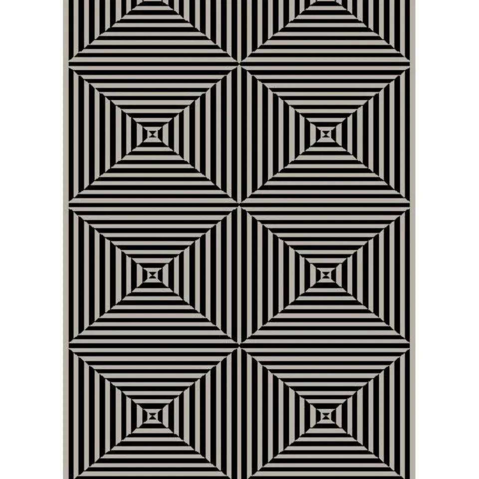- Uniek geometrisch design: Het moderne, optische patroon trekt de aandacht en creëert diepte in elke ruimte.