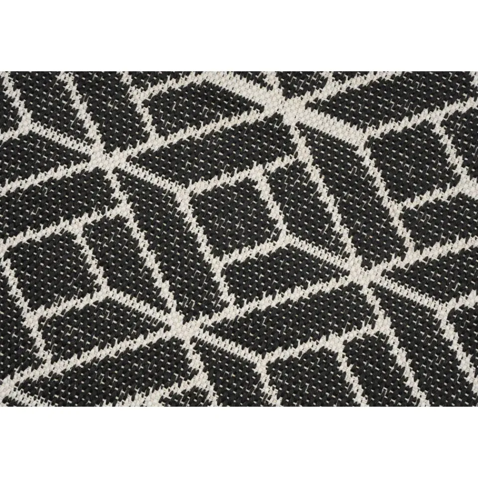 Het kleed is vervaardigd uit 100% polyester, een materiaal dat bekendstaat om zijn waterafstotende eigenschappen en duurzaamheid, waardoor het uitstekend bestand is tegen diverse weersomstandigheden. Het geometrische patroon in beige en zwart voegt een moderne en elegante uitstraling toe aan iedere ruimte, of dat nu je woonkamer, terras, of balkon is.