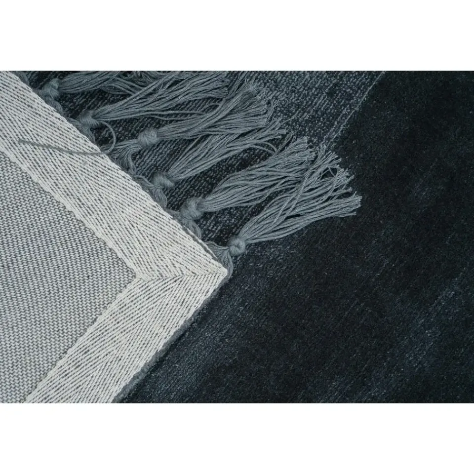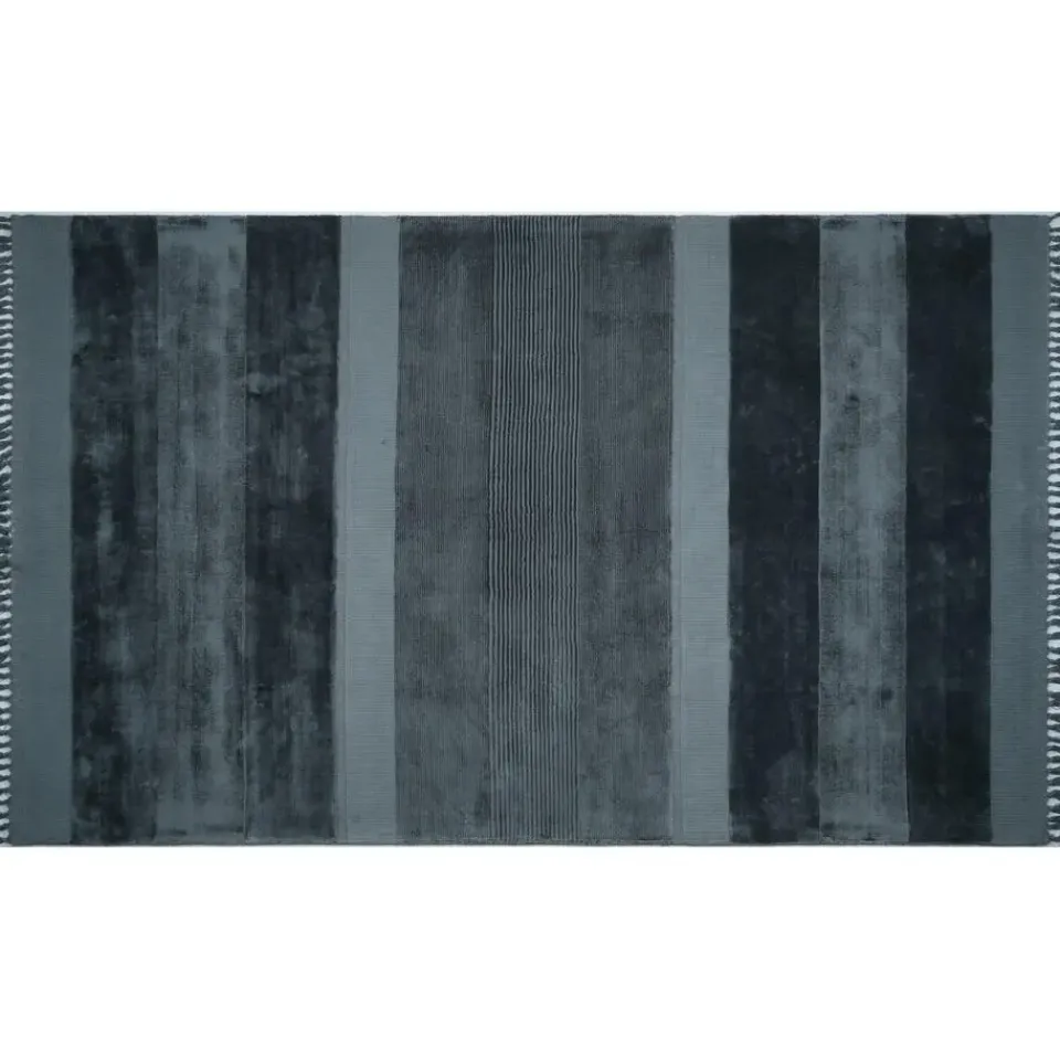 Dit vloerkleed heeft een diepzwarte kleur met subtiele glans, wat zorgt voor een verfijnde en moderne uitstraling. De strepen in verschillende texturen en de franjes aan de zijkanten geven het kleed een eigentijdse en speelse look, waardoor het een blikvanger is in elke ruimte. Viscose is bekend om zijn zijdezachte structuur en biedt een prachtig luxe gevoel onder de voeten.