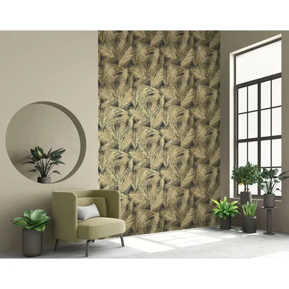 Met dit Dutch Wallcoverings vliesbehang uit de collectie Eden, ben je verzekerd van een mooi behang voor in je woonkamer of slaapkamer. Dit behang heeft een palm /jungle behang motief in de kleur(en) zwart/metallic/goud. Met het vliesbehang Eden palm zwart/metallic goud creëer je een botanische sfeer in je interieur. Dit behang heeft een afmeting van 10m x 53cm en heeft een verspringend rapport van 26,5 cm.