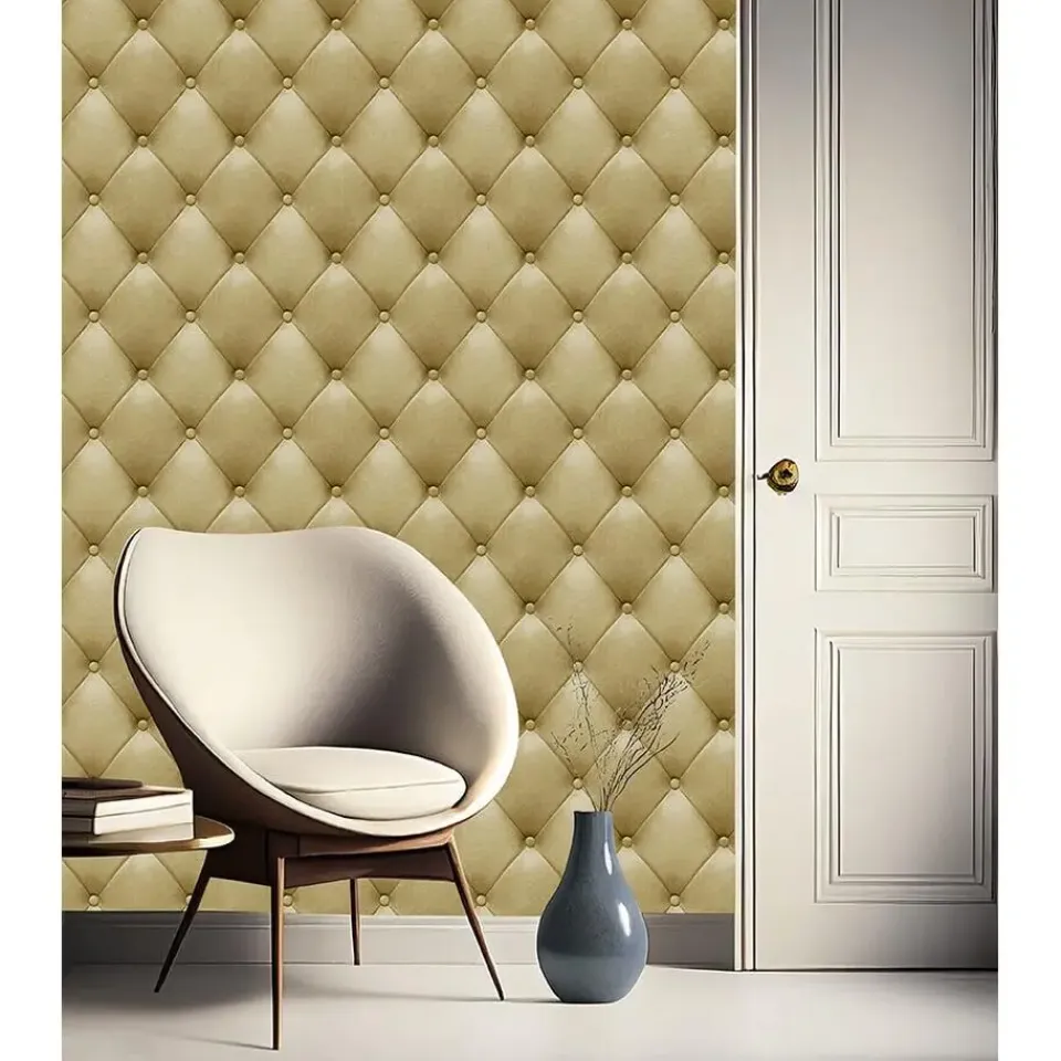 Het Artifice-vliesbehang met kapiton in oker brengt een gevoel van luxe en comfort in elke ruimte. Het ontwerp imiteert een gewatteerde, gestoffeerde wand met een warme okergele tint, wat zorgt voor een rijke en uitnodigende uitstraling. Dit behang is perfect voor het creëren van een stijlvolle sfeer in bijvoorbeeld een slaapkamer, woonkamer of een chique kantoor. Het vliesbehang is eenvoudig aan te brengen en biedt een naadloze afwerking, terwijl het duurzame materiaal zorgt voor een lange levensduur. Voeg een vleugje elegantie en warmte toe aan je interieur met dit unieke behangontwerp.