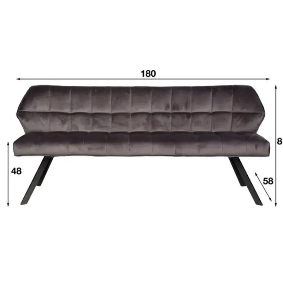 Trendy eetkamerbank Rilla heeft een zitting en rugleuning in fluweel die volledig gemaakt zijn uit PU. Ook de stiknaden dragen bij aan de stijlvolle uitstraling. De bank in antraciet wordt gecombineerd met een stevig zwart onderstel van gepoedercoat staal. Met zijn lengte van 180 cm kan de bank gemakkelijk 3 mensen dragen.