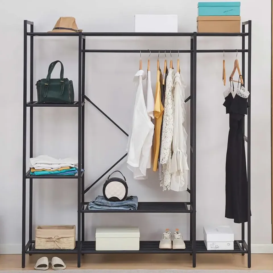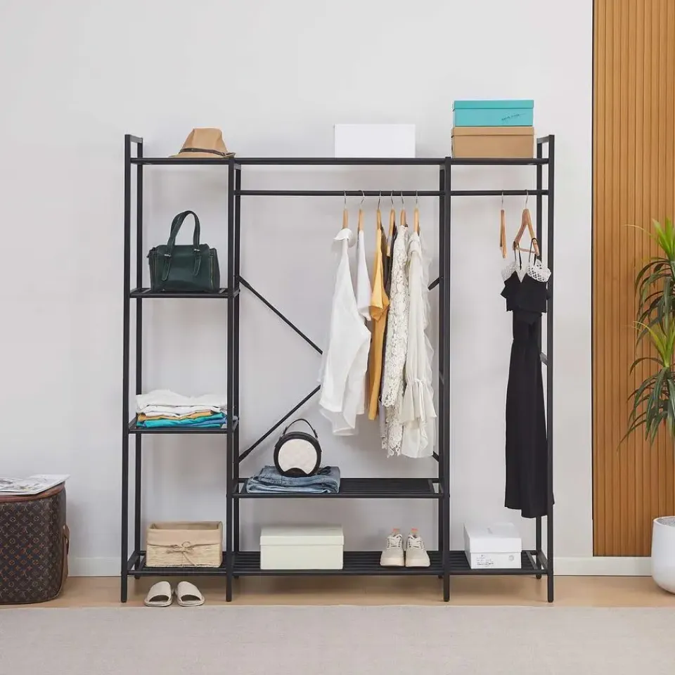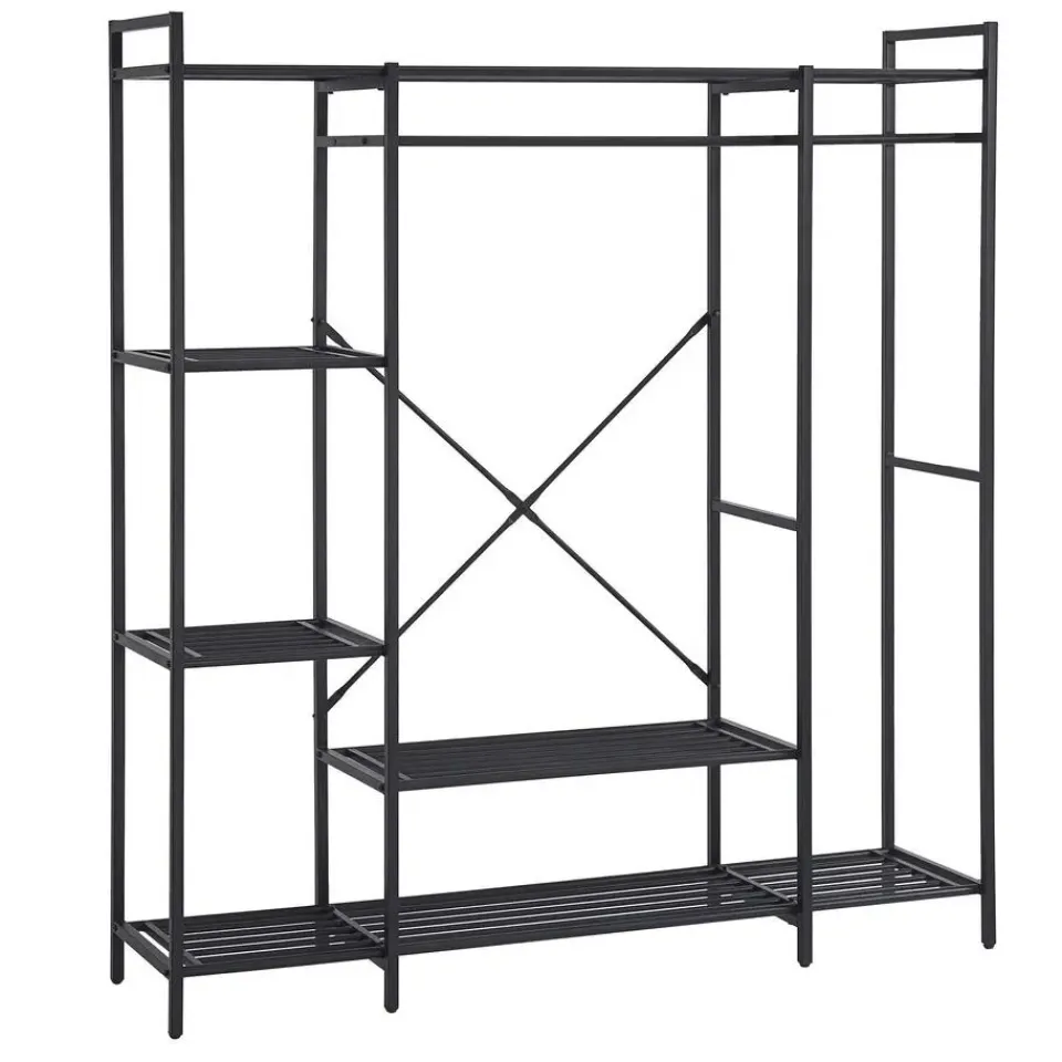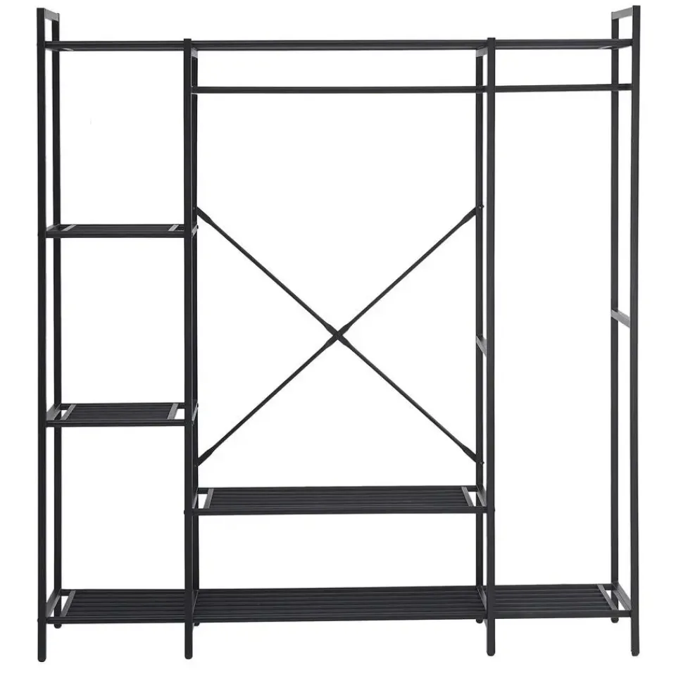 Op zoek naar een praktisch en modern kledingrek? Het Marek metalen kledingrek biedt de perfecte balans tussen functionaliteit en stijl. Met zijn stevige stalen frame en strakke zwarte afwerking is dit kledingrek een stijlvolle toevoeging aan je slaapkamer, hal of inloopkast. Het slim ontworpen rek is uitgerust met twee kledingroedes voor jassen, blouses en dergelijke, en vier zijplanken voor opgevouwen kleding en accessoires. Daarnaast zijn de onderste planken handig voor schoenen, dozen of opbergmanden. Dankzij de open structuur houd je al je kledingstukken en accessoires overzichtelijk en binnen handbereik. Ontdek de volledige collectie Marek op onze website.