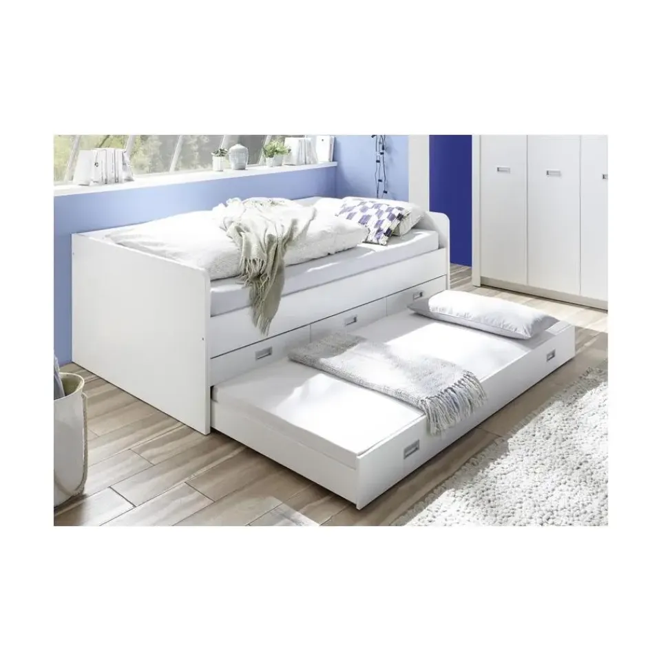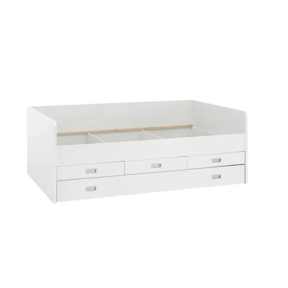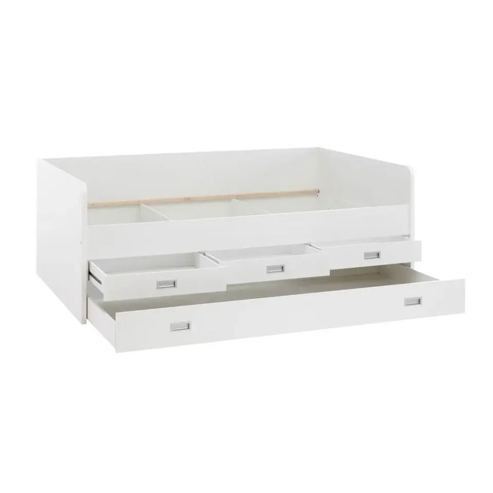 Het bed zelf is gemaakt uit spaanplaat in wit en is naast de bedlade ook nog eens uitgerust met 3 handige schuiflades, waarin je bedlinnen of kleding netjes kan opbergen. Meer meubelen van deze leuke reeks vind je op onze website!