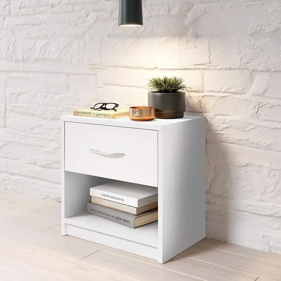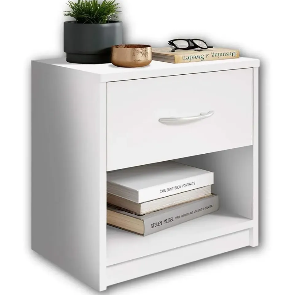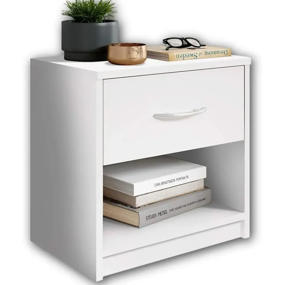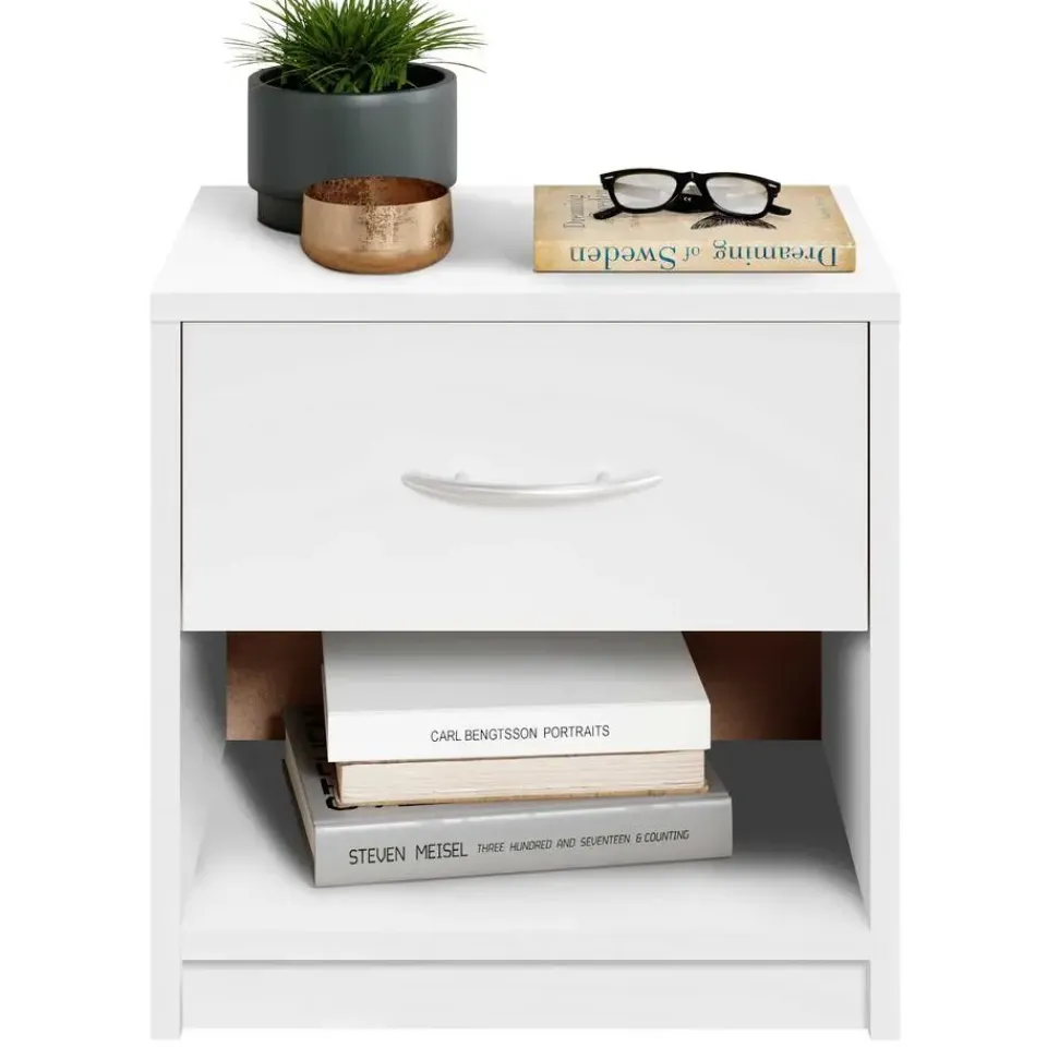 Dit simpele, maar moderne en elegante nachtkastje Beppu van Emob is werkelijk overal inzetbaar. Dit compacte meubel uit spaanplaat is uitgerust met 1 schuiflade, die op zijn beurt is voorzien van een gebogen handgreep. Onder de lade heb je bovendien nog een open opbergvak, zodat je alledaagse spullen zoals boeken en decoratie eenvoudig en snel kan opbergen. Kortom, een erg handig meubel voor een klein prijsje! Ontdek ook de andere meubelen en uitvoeringen van dit Beppu-nachtkastje van Emob op onze website.