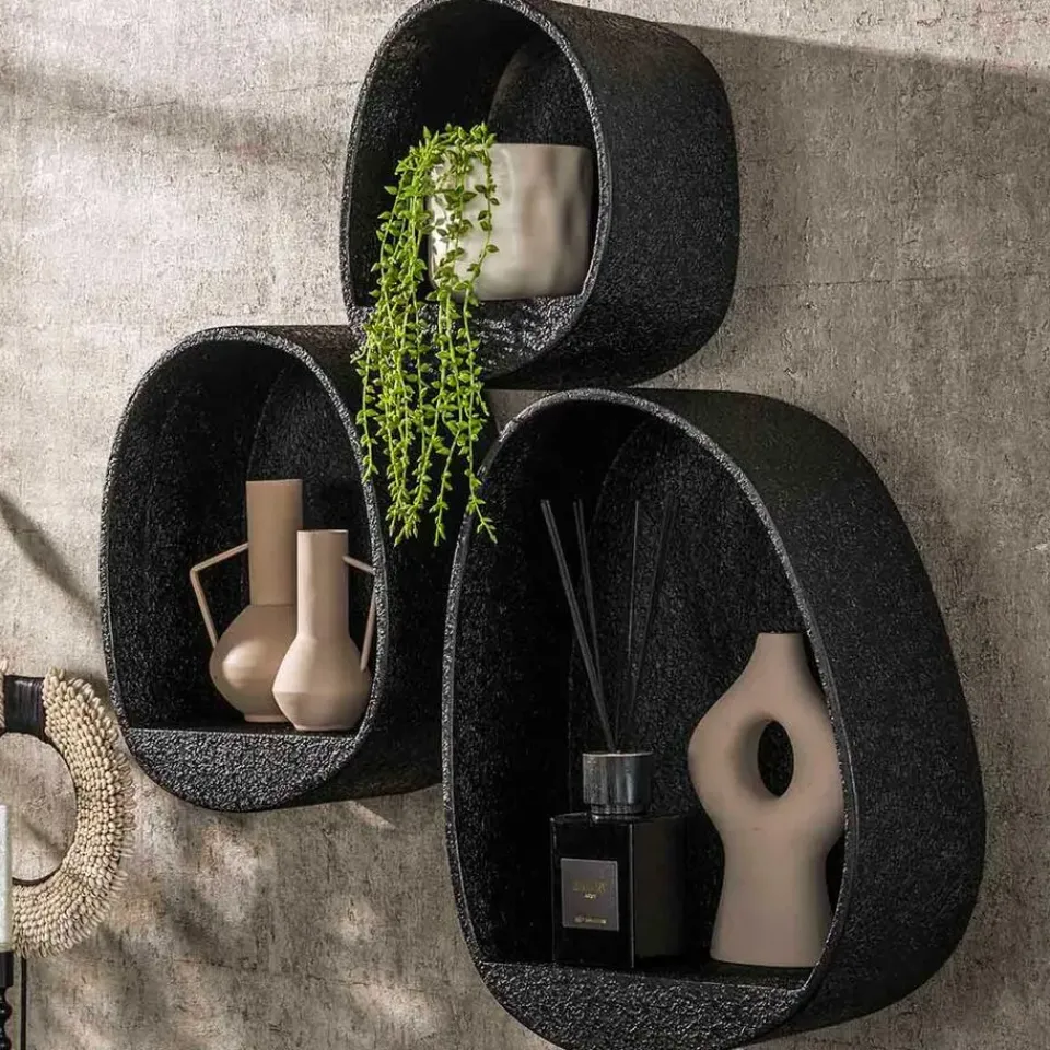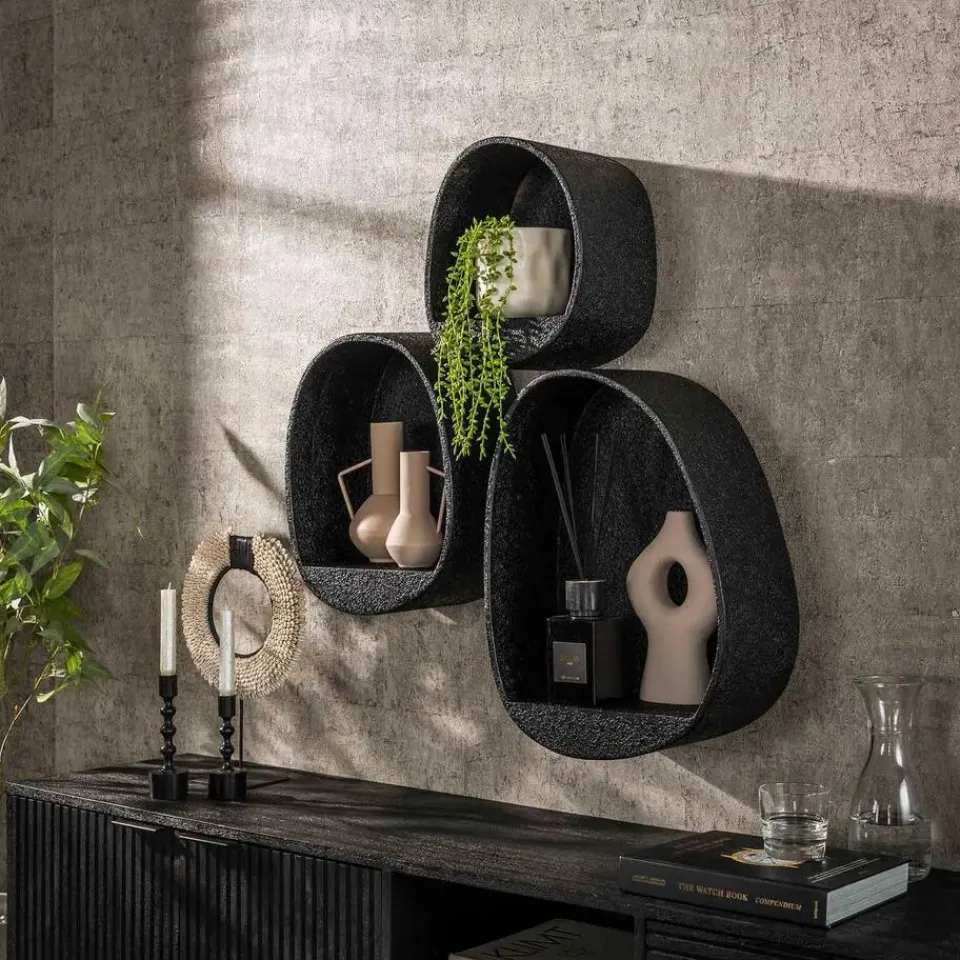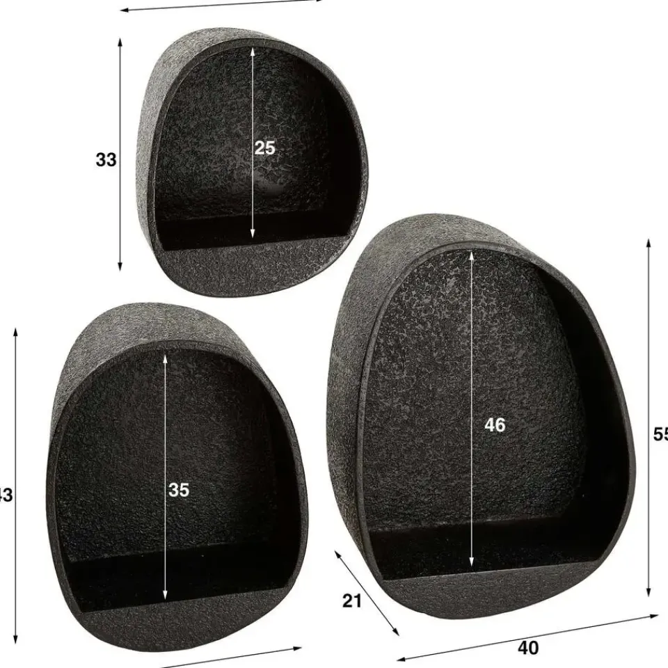 Ontdek de stijlvolle set van 3 wandschappen Licorice in liquid metal. Deze elegante schapjes voegen een vleugje verfijning toe aan elke ruimte. Elk schap beschikt over een open vak, perfect voor het tentoonstellen van uw favoriete decoratieve items, boeken of planten. De moderne afwerking en strakke lijnen maken deze wandschappen een ideale aanvulling op elk interieur, van eigentijds tot klassiek. Creëer een georganiseerde en uitnodigende sfeer met deze veelzijdige set, die eenvoudig te monteren is en moeiteloos elke muur transformeert. Verhoog de esthetiek van uw huis met de tijdloze charme van de Licorice wandschappen.