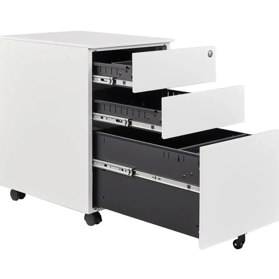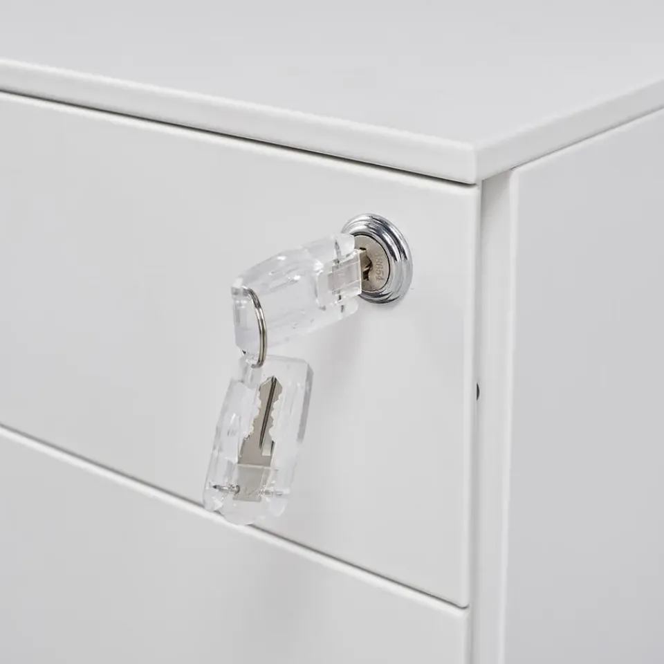 Hoewel tegenwoordig veel digitaal is, heb je toch nog papierwerk, schrijfmateriaal en andere accessoires nodig tijdens het werk. Deze bureaukast is voorzien van 3 lades, waarvan 1 archieflade en 1 lade met een slot. De bovenste lade is afsluitbaar door een unieke sleutel. Zo berg je gemakkelijk al jouw waardevolle items op. De tweede lade kun je gebruiken voor al jouw schrijfmaterialen en andere accessoires. De onderste lade is voorzien van een rek, waaraan je hangmappen kan hangen.