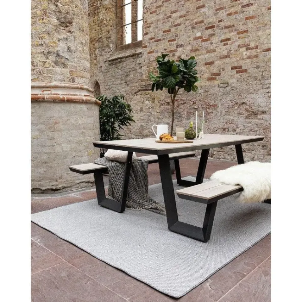 Buitenvloerkleed Mono is gemaakt van polypropyleen. Dit materiaal is bestand tegen bacteriegroei. Het vloerkleed wordt niet snel vies en is erg makkelijk schoon te maken. Door de neutrale kleur is het buiten vloerkleed goed te combineren. Dit vloerkleed is aan beide kanten te gebruiken en gaat daardoor extra lang mee.