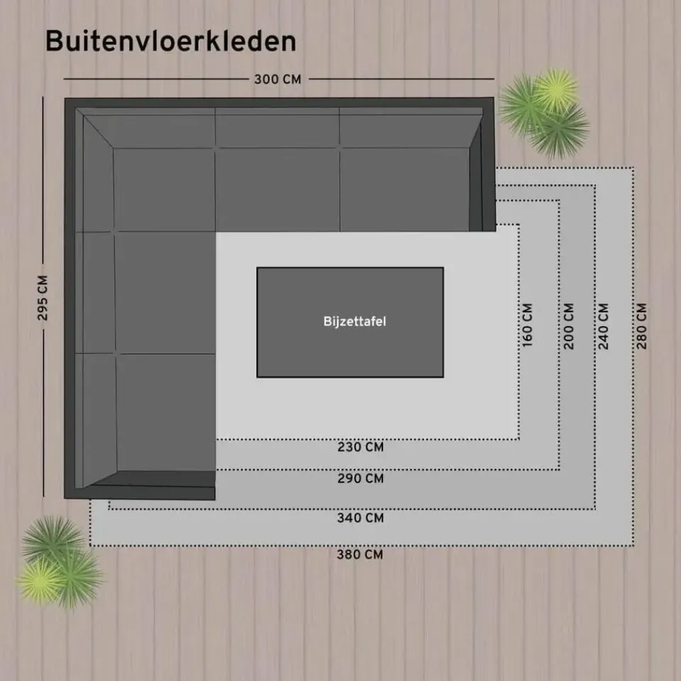 Het Frost buitenkleed is beschikbaar in rechthoekige en ronde vormen, met afmetingen van 160×230 cm, 200×290 cm, 240×340 cm, 280×380 cm (rechthoekig) en 200 cm of 240 cm (rond). Met een dikte van 10 mm voelt het kleed comfortabel aan, terwijl het duurzame en weerbestendige materiaal zorgt voor langdurig gebruik en eenvoudig onderhoud. Perfect om een stijlvolle en gezellige buitenruimte te creëren!