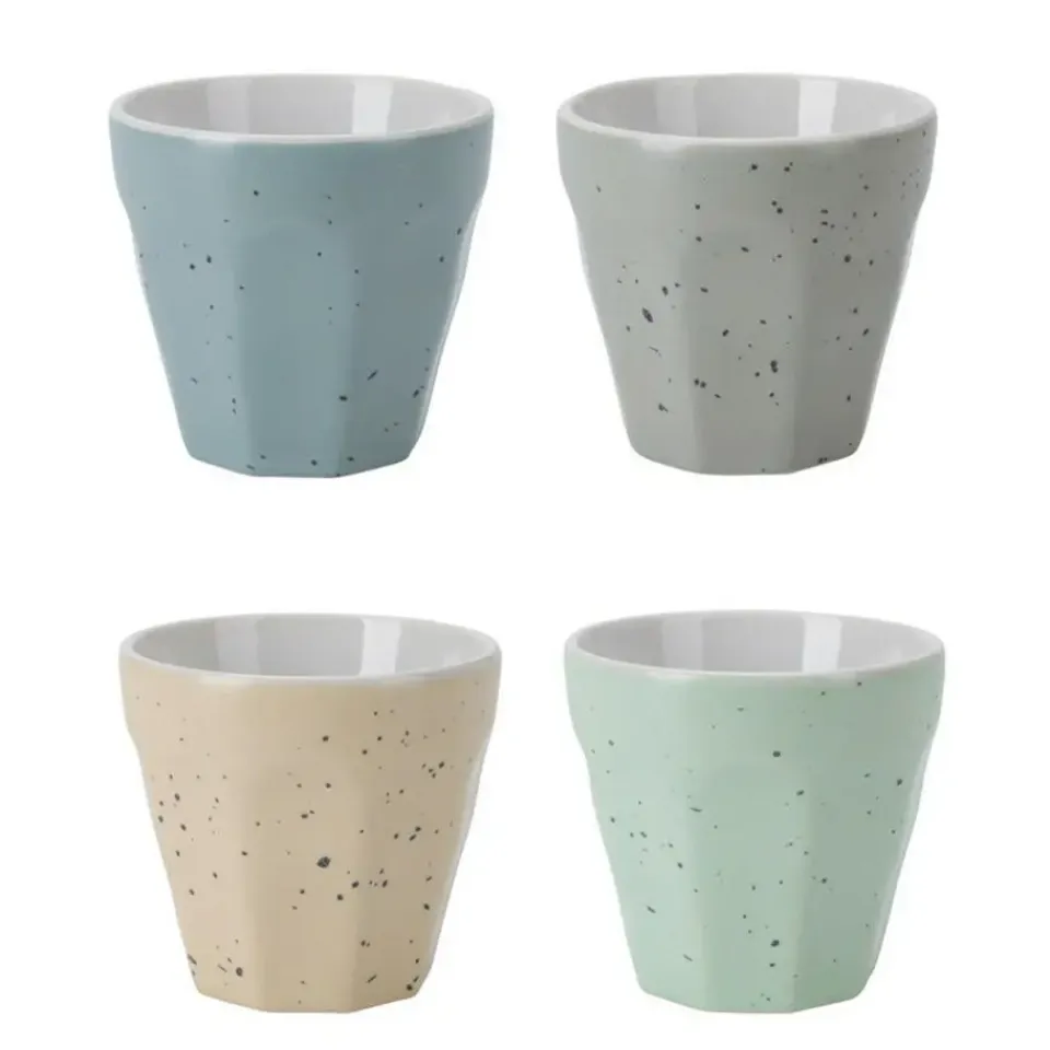 Excellent Houseware Koffiekopjes – beker set – 4x stuks – porselein – 90 ml – gekleurd. Geniet van espresso in stijl met deze set van 4 kleine koffiekopjes van Excellent Houseware. De kopjes zijn gemaakt van stoneware en hebben een matte afwerking met subtiele stippeltjes. De set bestaat uit vier moderne kleuren: beige, groen, lichtgrijs en blauw. Met een inhoud van 90 ml zijn de bekers ideaal voor espresso of ristretto. Dankzij hun formaat van 6,5 x 6,5 x 6 cm liggen ze prettig in de hand en zijn ze een elegante aanvulling op elk servies. Perfect voor dagelijks gebruik of als stijlvol cadeau.