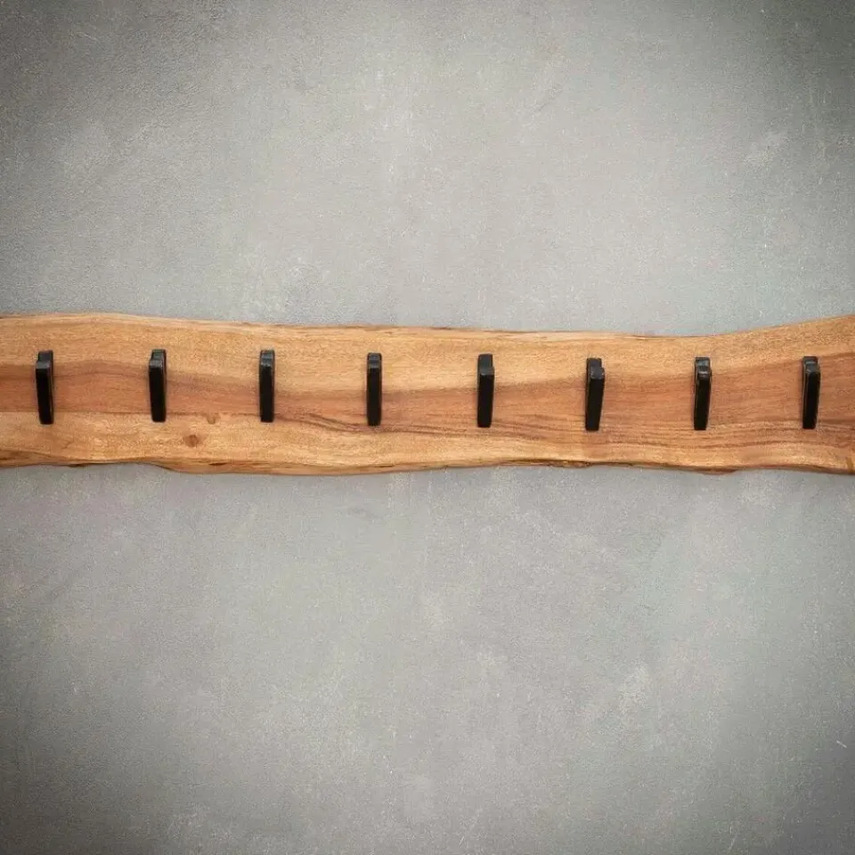 Maak uw hal of slaapkamer helemaal af met deze natuurlijke en rustieke Carter wandkapstok! Deze kapstok is gemaakt van stevig massief acaciahout en is voorzien van een fijne nerf en verschillende noesten, waardoor hij zijn unieke uitstraling krijgt. De stoere haken zijn gemaakt van zwart geschuurd metaal en vormen een mooi contrast met het hout. Dit model heeft 8 haken, maar hij is ook verkrijgbaar met 5, 2×6 of 2×3 haken. Tevens is hij verkrijgbaar in een variant met hoedenplank met en zonder haken.