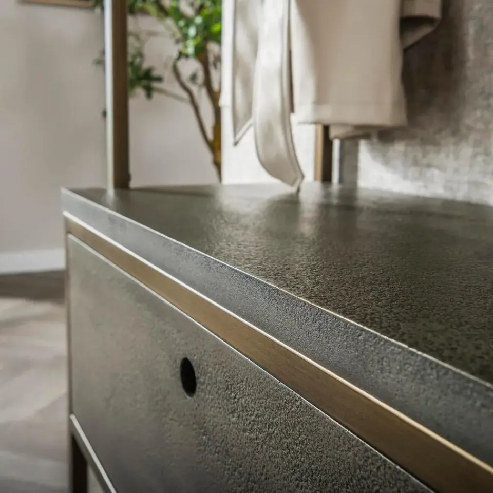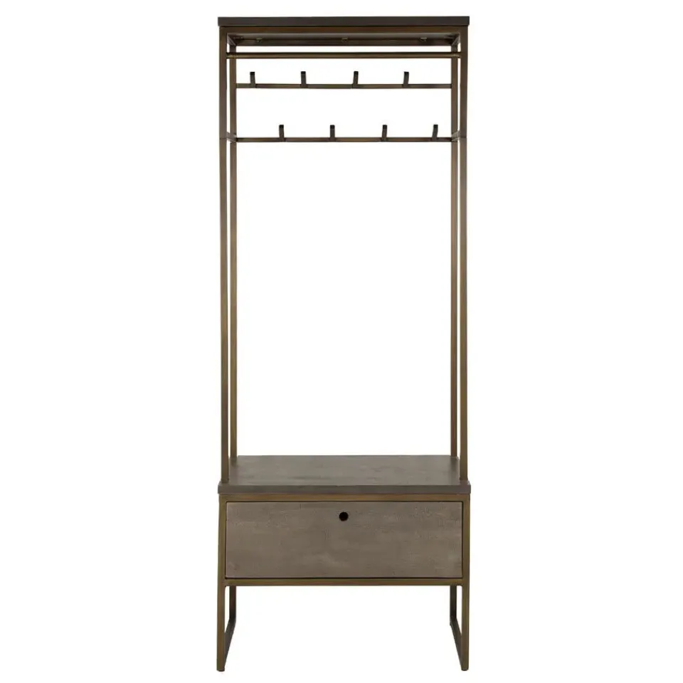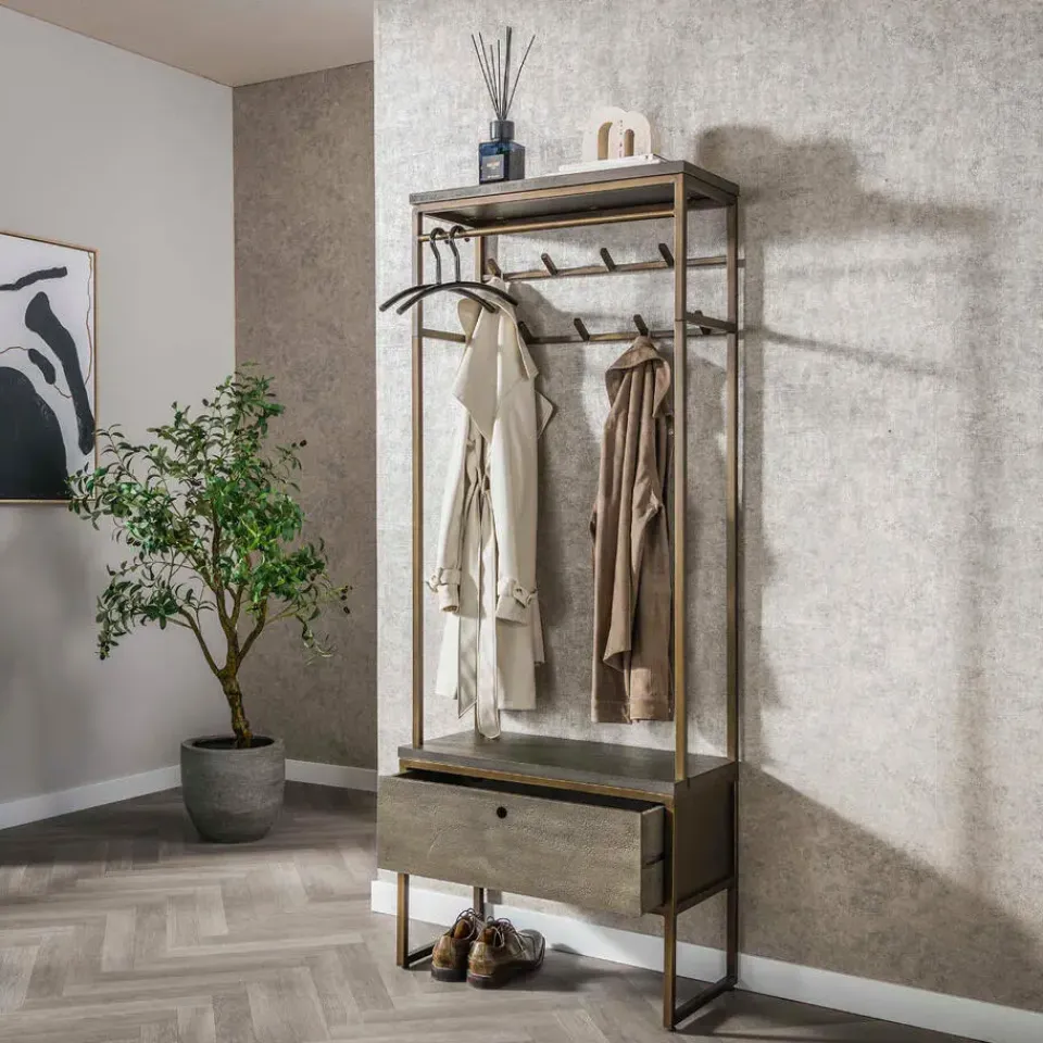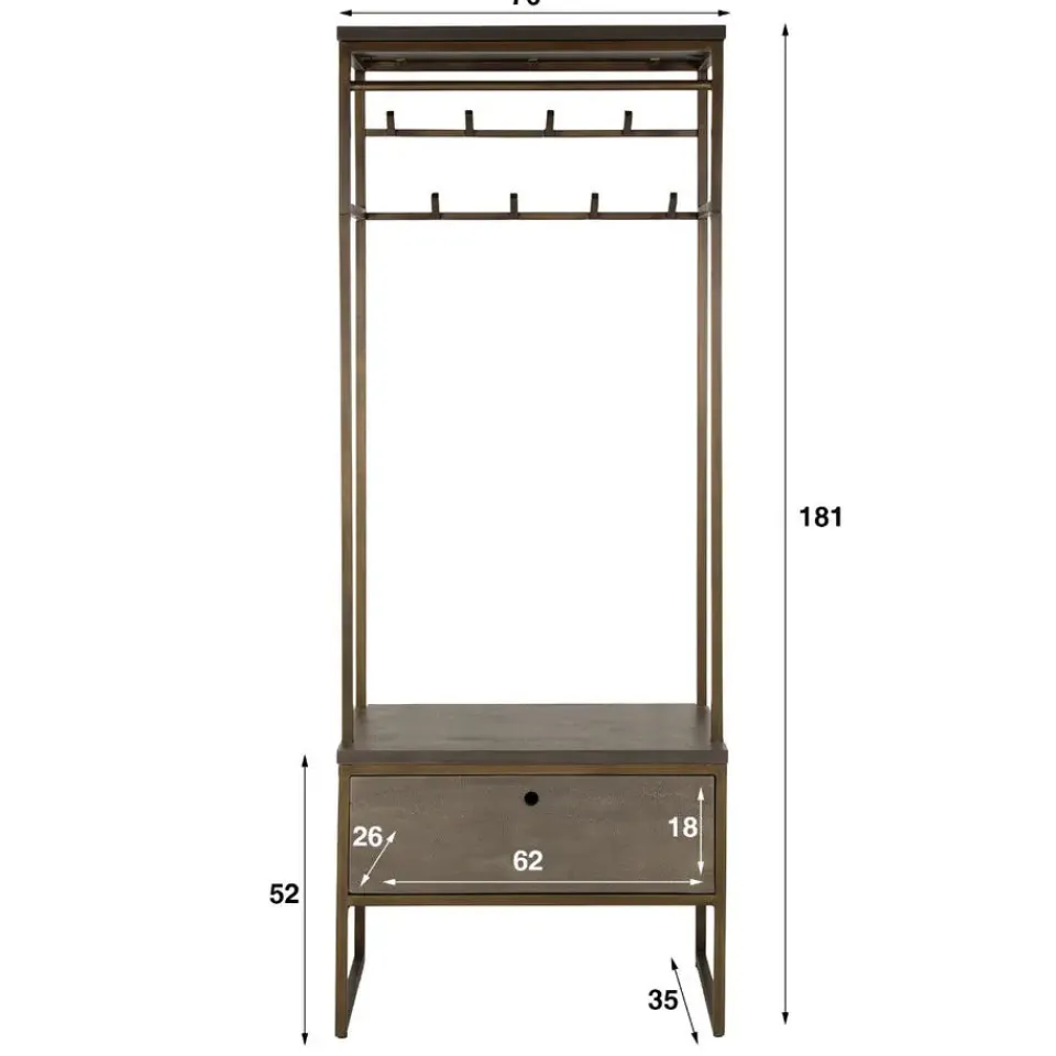 Dit garderobemeubel ‘Nowi’ is vervaardigd met een ambachtelijke Nowi finish, wat zorgt voor een unieke 3D-structuur die elke ruimte een stijlvolle uitstraling geeft. Met acht haken en een roede in een brass antiek finish biedt deze kapstok niet alleen functionaliteit, maar ook een vleugje elegantie aan ieder interieur. Dit meubel beschikt ook over een lade. Dit garderobemeubel maakt onderdeel uit van de ‘Nowi’ serie.