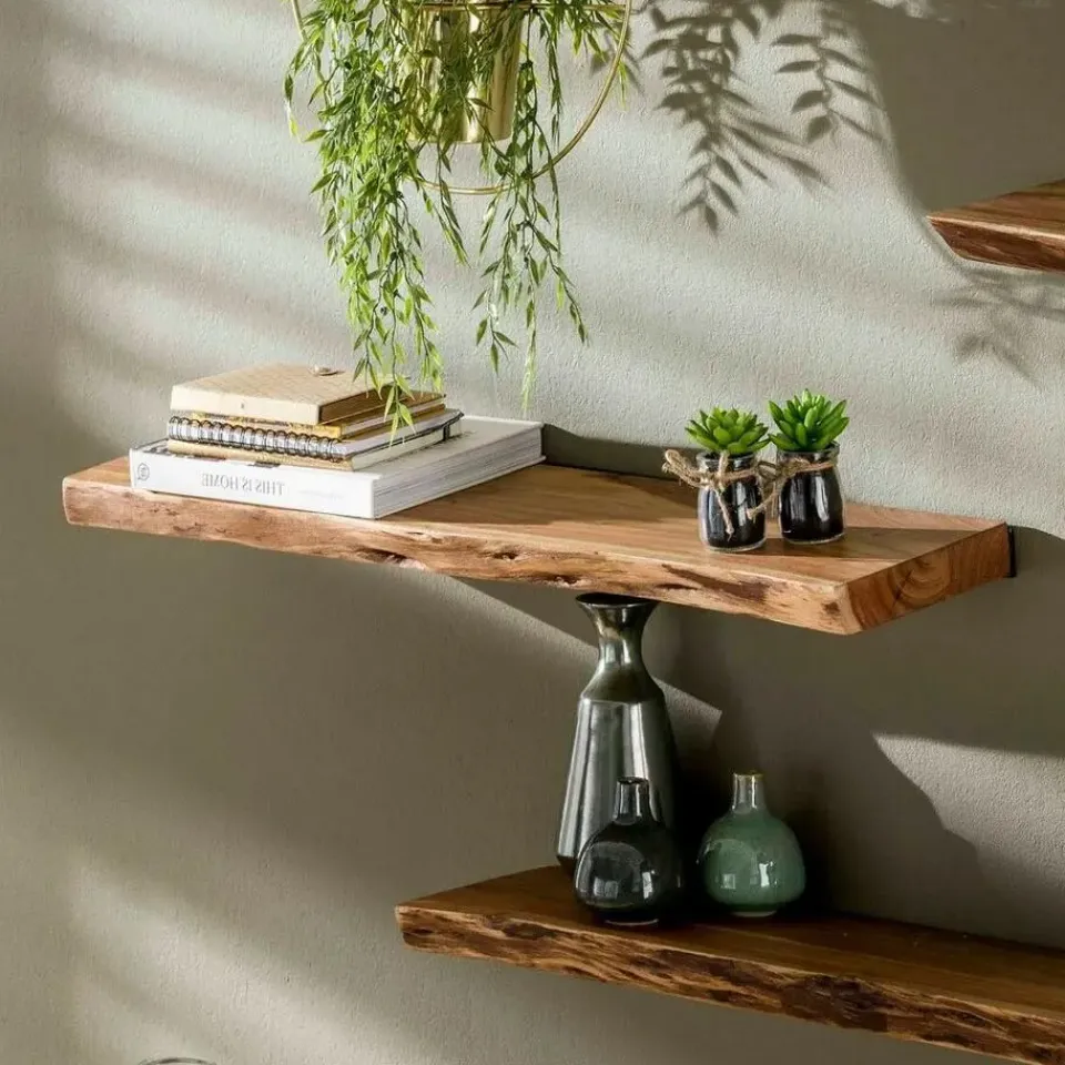 Wandplank Edwin is onmisbaar als u die lege muur een gezellige en warme uitstraling wilt geven. Deze wandplank heeft een breedte van 90 cm en is uitgevoerd in massief acaciahout met een blanke lak als afwerking. Dankzij zijn ontwerp met de uitstraling van een boomstam, zorgt deze plank gemakkelijk voor een natuurlijke en stoere sfeer in uw favoriete ruimte. Door middel van een blinde schapdrager, is dit wandschap gemakkelijk aan de muur te bevestigen. Hang deze wandplank in de woonkamer, slaapkamer, hal of werkkamer en decoreer hem met beeldjes, plantjes of vaasjes voor een persoonlijke finishing touch. Combineer wandplank Edwin ook met de andere twee formaten: 60 cm en 120 cm, voor een speels effect.