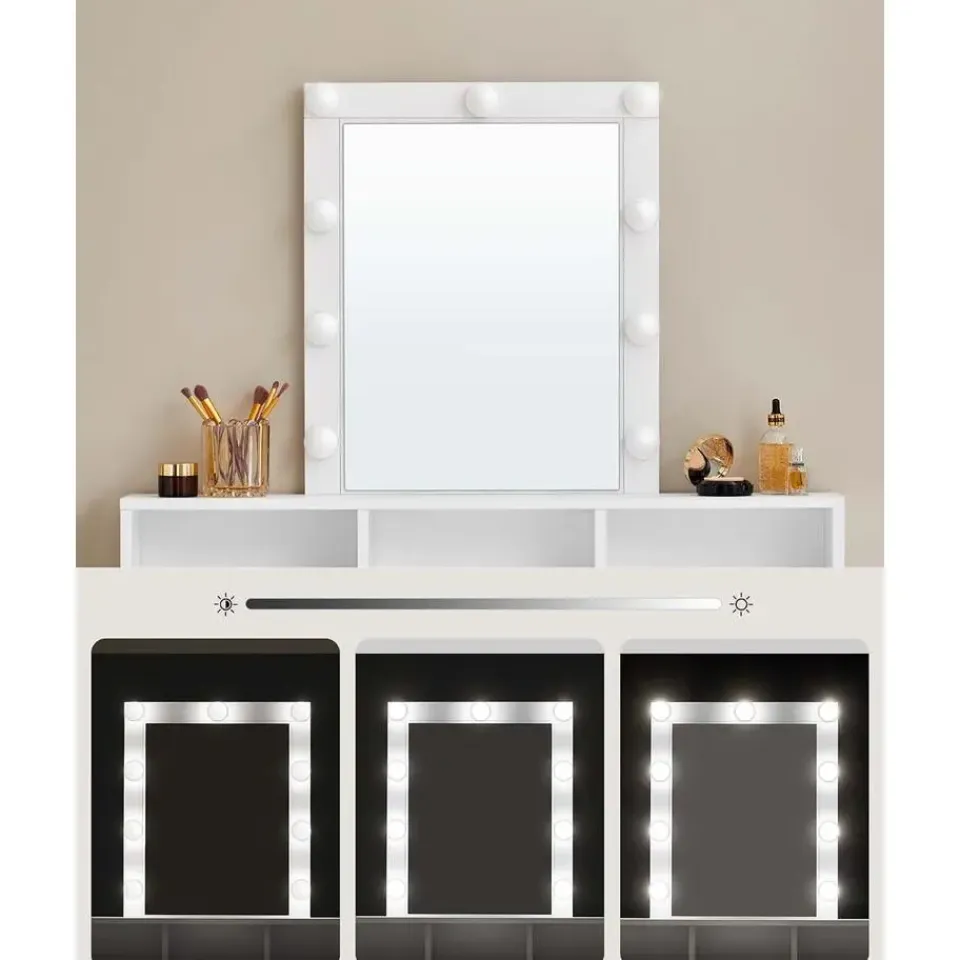 De zijwanden zijn verstevigd met een plaat aan de achterkant die een stabiele structuur creëert zonder dat de kaptafel begint te wiebelen bij elke beweging die je maakt of wanneer er iets op wordt gezet. Bovendien is er ook nog eens genoeg ruimte links en rechts om al je cosmetische producten neer te zetten. De verlichting kan worden ingesteld naar de gewenste helderheid, waardoor je altijd goed geïnformeerde beslissingen over jouw make-up kunt nemen.