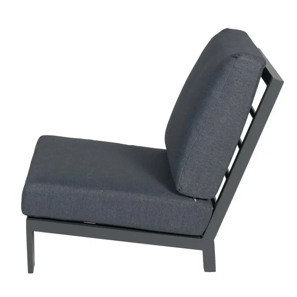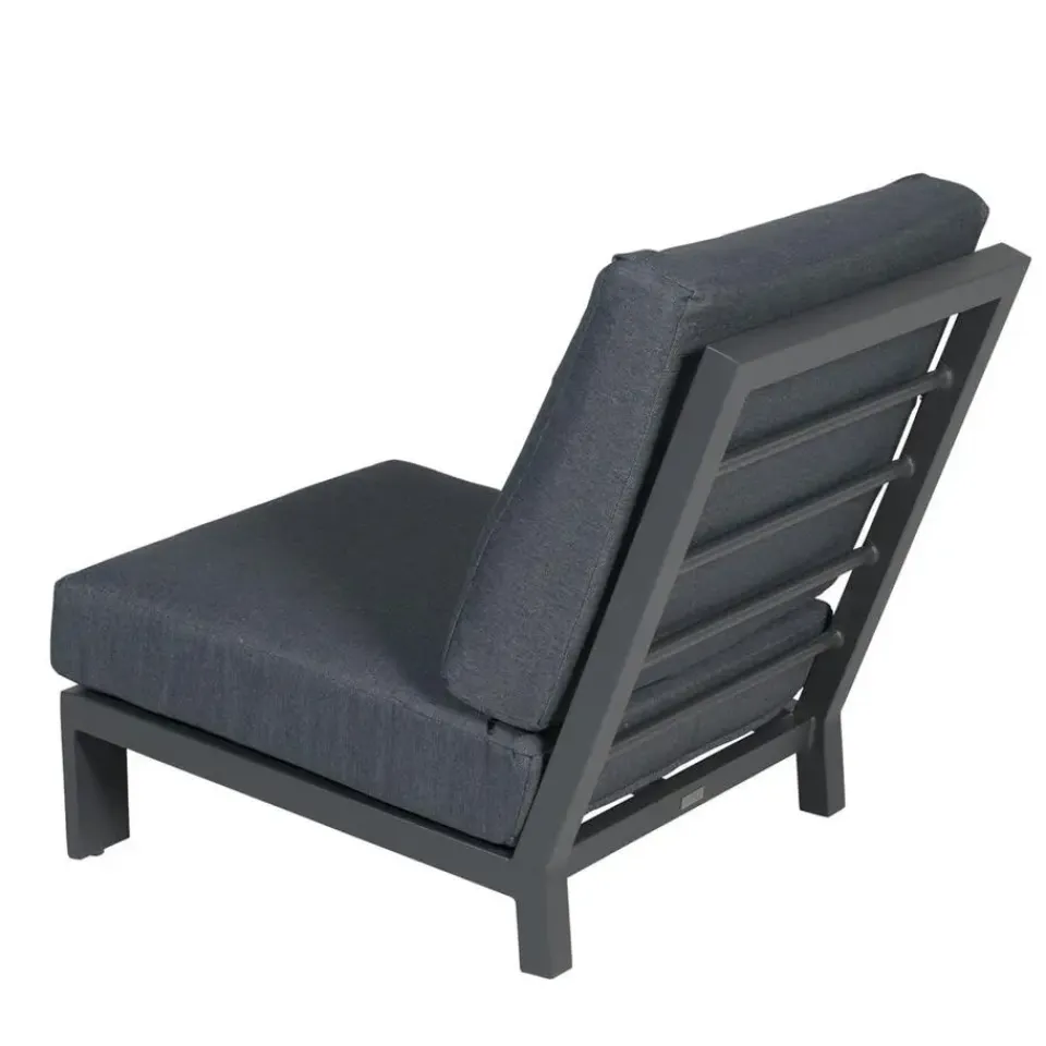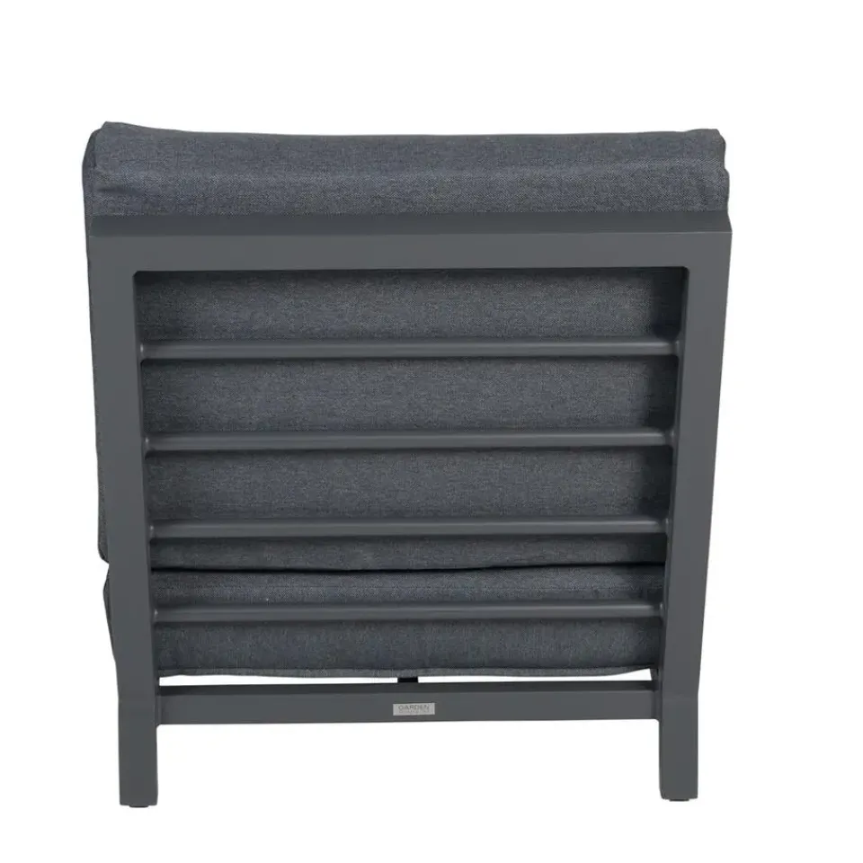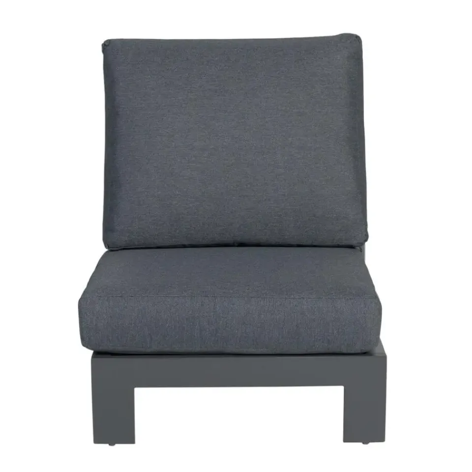 Het lounge midden element is compleet gemaakt van aluminium en heeft een stevige zwarte poedercoating. Dit aluminium frame is onderhoudsvrij en weerbestendig. De meegeleverde dikke polyester kussens zijn voorzien van een rits. De hoes is afneembaar en kan eenvoudig met de hand gewassen worden. De kussens zijn niet waterbestendig, maar wel waterafstotend. Stel dat er drinken op het midden element gemorst wordt, dan kan dit er gemakkelijk afgeveegd worden.