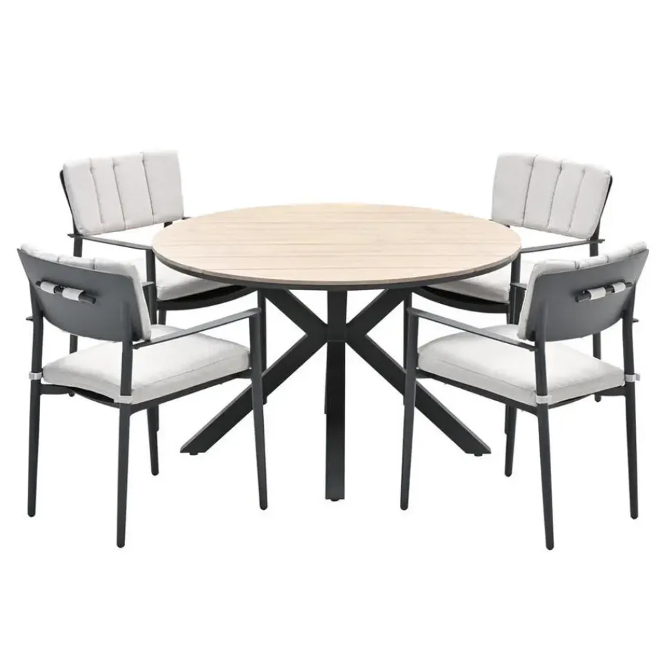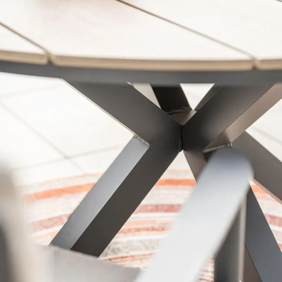 De Tulli tuintafel is vervaardigd uit een aluminium frame voorzien van een stevige poeder coating laag. Het frame is fraai vormgegeven door de kruis tafelpoten die schuin onder de tuintafel zijn geplaatst, hierdoor krijgt de tuintafel een speciaal en uniek uiterlijk. Het tafelblad is gemaakt van vironwood latten, dit is een onderhoudsvriendelijke kunststof met een mooie houtuitstraling. Let wel op voor scherpe voorwerpen en vector vorming anders heb je zo krassen of smeltpuntjes in het vironwood.
