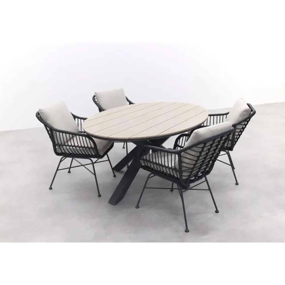 Op zoek naar een gezellige tuinset voor 4? Dan is deze Margriet/Edison tuinset van Garden Impressions een ideale keuze! Door het gebruikte materiaal is deze tuinset helemaal van deze tijd, met een paar knipogen naar vroeger. Zo is de Margriet tuinstoel voorzien van zwart wicker. Dat geeft toch die vintage uitstraling. Het zwart past perfect bij het onderstel van de Edison tuintafel. Met een afmeting van 180×115 cm. is deze tuinset perfect voor 4 personen! Bestellen kan direct online.