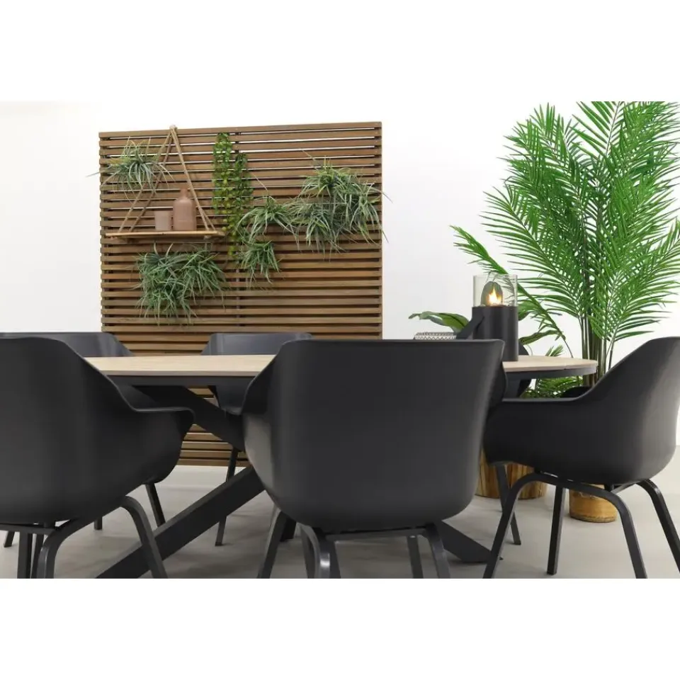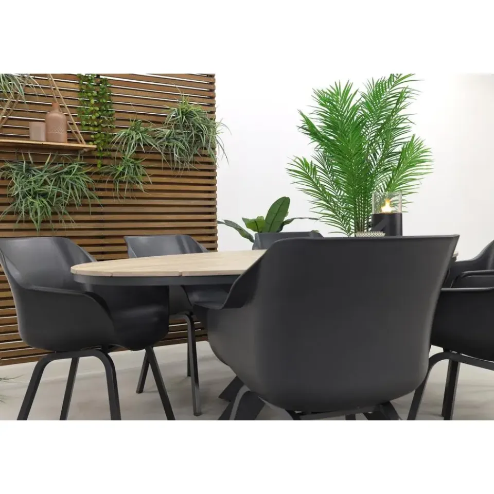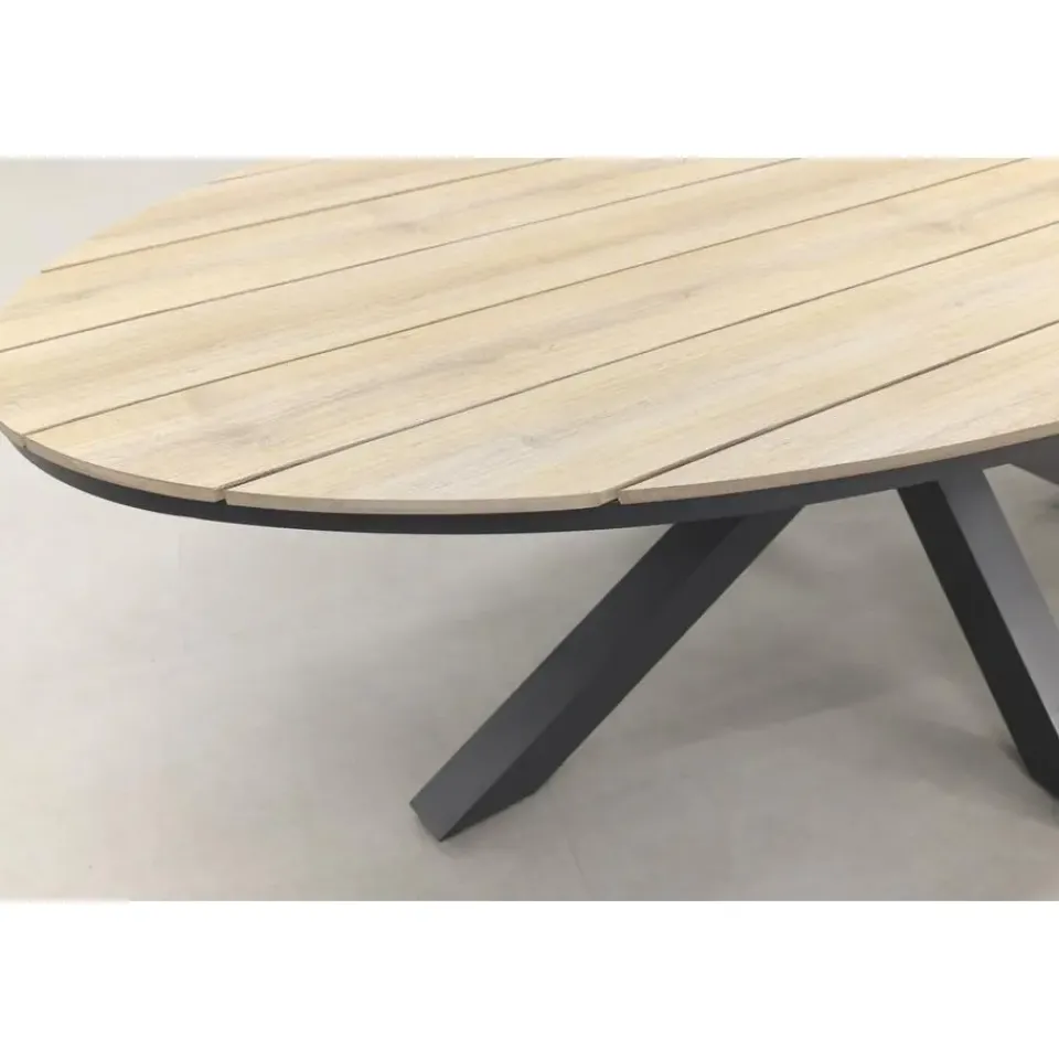 Het unieke kruisonderstel is gemaakt van stevig aluminium en behandeld met een coating. Door deze coating wordt het onderstel kras- en stoot vast en heeft het zijn mooie antracieten kleur gekregen. Aluminium wordt veel gebruikt voor tuinmeubelen omdat het licht van gewicht is en onderhoudsvrij is. Het tafelblad van de Edison tuintafel is gemaakt van polywood. De polywood latten zijn in een ovale vorm over het frame gelegd. Polywood is een soort kunststof met de uitstraling van hout. Het voordeel van dit materiaal is dat het niet gaat ‘werken’ zoals echt hout. Bij polywood dien je wel rekening te houden met het plaatsen van glaswerk, bloempotten etc. Lees hiervoor het onderhoudsadvies.