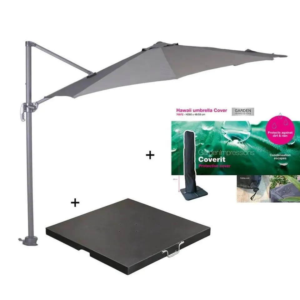 De Hawaii zweefparasol S is eenvoudig te verstellen en te draaien en hoeft daarom niet verplaatst te worden. De parasol zet je in een handomdraai eenvoudig schuin, door middel van het handvat schuif je het doek in verschillende standen schuin. Dit kan tot bijna 90 graden, daarnaast is de Hawaii S parasol ook nog eens 360 graden rond te draaien. De Hawaii zweefparasol wordt geleverd inclusief luxe parasolvoet en parasolhoes. De luxe granieten voet van 80 kg is voorzien van wielen. Hierdoor is de parasol te verplaatsen en is het samen met de parasol een mooi geheel. Naast de luxe parasolvoet wordt er ook een parasolhoes meegeleverd. Deze kan je over het parasoldoek doen wanneer de parasol is ingeklapt. Bij slecht weer raden wij aan om de parasol op te bergen in de schuur. Zo verleng je de levensduur van de prachtige zweefparasol. Om de zweefparasol te monteren worden alle benodigdheden meegeleverd. Het draaiplateau moet op de meegeleverde voet worden gemonteerd. Daarna kan de binnenpaal op het draaiplateau worden gemonteerd. Als laatste kan dan de Hawaii parasol erover geschoven worden. Dit is eenvoudig zelf te doen met de bijgeleverde handleiding en montagebenodigdheden.