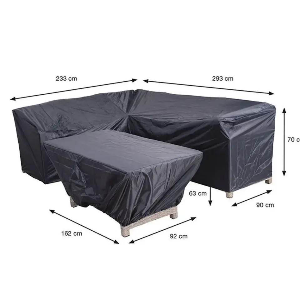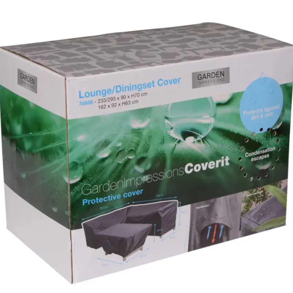 Ben je op zoek naar een beschermhoes voor jouw lounge dining set? Deze prettige lounge dining afdekhoes van kwaliteitsmerk Garden Impressions zorgt ervoor dat je langer plezier zult hebben van jouw lounge dining set. Om de levensduur van je lounge dining set te verlengen, raden wij aan om deze af te dekken in de wintermaanden. De beschermhoezen van Garden Impressions zijn gemaakt van hoogwaardig polyester met een ademende coating. Deze coating zorgt ervoor dat hoes waterbestendig is. De hoes is niet volledig waterdicht, maar waterafstotend. Het is een flexibele ademende coating, waardoor de hoes in de wintermaanden ook nog flexibel blijft. Doordat de hoes niet volledig waterdicht is, is aan te raden om een afstand te creëren tussen de meubelen en de hoes. Het water kan er dan gemakkelijker afstromen en de meubelen kunnen niet verstikken. De beschermhoes is voorzien van ventilatie driehoeken zodat het tuinmeubel kan ademen. De lounge dining hoes kan gemakkelijk om de lounge dining set worden bevestigd. Op alle hoeken zit onderaan een elastieken band om de hoes strak te houden. We raden je aan om de kussen niet onder de hoes te laten liggen. Mocht de kussens al nat zijn geworden, is dat niet erg maar zorg er wel voor dat ze droog worden opgeborgen. De lounge dining set hoes met afmeting 233/293x90xH70 cm en 162x92xH63 cm.