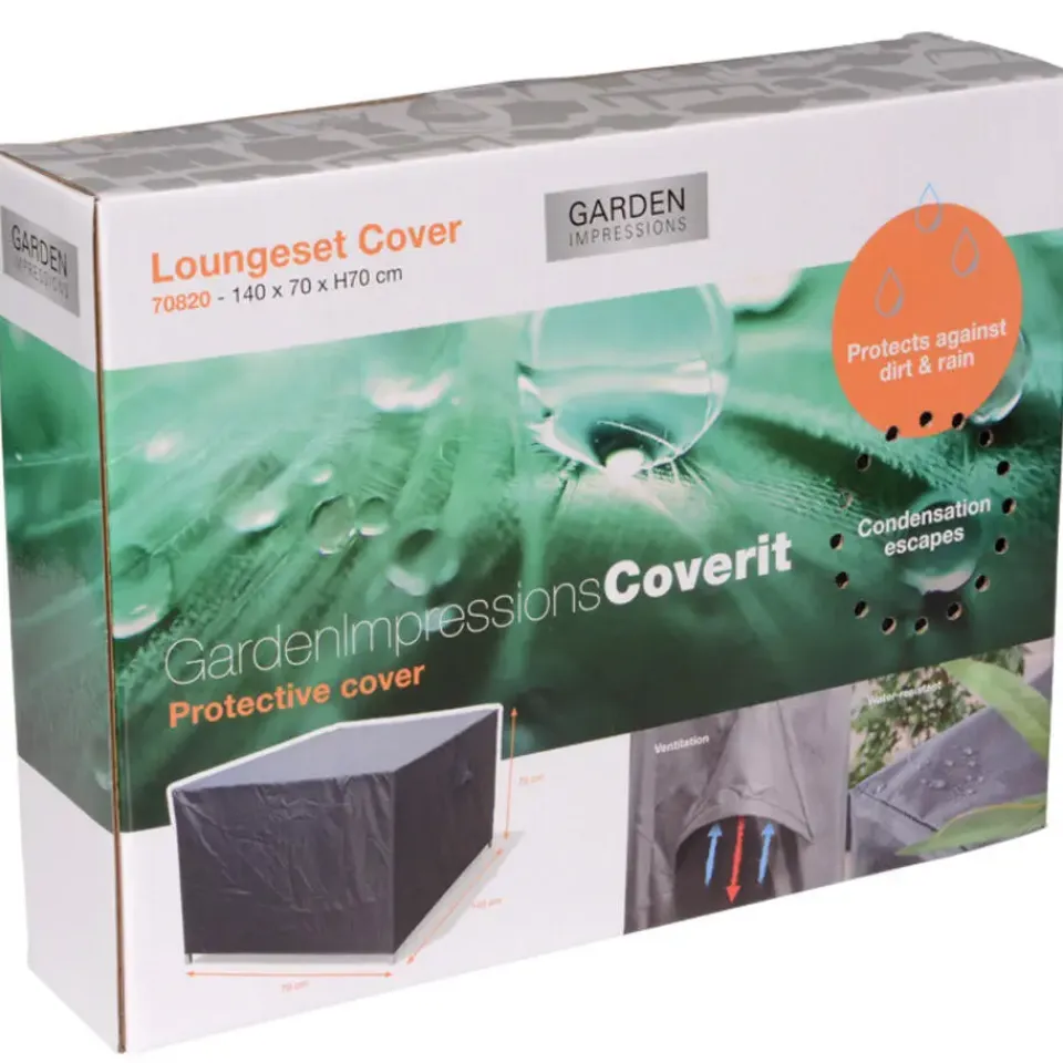 Ben je op zoek naar een beschermhoes voor jouw loungeset? Deze prettige loungesethoes van kwaliteitsmerk Garden Impressions zorgt ervoor dat je langer plezier zal hebben van jouw loungeset. Om de levensduur van je loungeset te verlengen, raden wij aan om deze af te dekken in de wintermaanden. De beschermhoezen van Garden Impressions zijn gemaakt van PVC met een ademende coating. Deze coating zorgt ervoor dat hoes waterbestendig is. De hoes is niet volledig waterdicht, maar waterafstotend. Het is een flexibele ademende coating, waardoor de hoes in de wintermaanden ook nog flexibel blijft. Doordat de loungesethoes niet volledig waterdicht is, is aan te raden om een afstand te creëren tussen de meubelen en de beschermhoes. Het water kan er dan gemakkelijker afstromen en de meubelen kunnen niet verstikken. De beschermhoes is voorzien van ventilatie driehoeken zodat het tuinmeubel kan ademen. De loungesethoes kan gemakkelijk om de loungeset worden bevestigd. Op alle hoeken zit onderaan een elastieken band om de hoes strak te houden. We raden je aan om de kussens niet onder de beschermhoes te laten liggen. Mocht de kussens al nat zijn geworden, is dat niet erg maar zorg er wel voor dat ze droog worden opgeborgen. De loungesethoes met afmeting 140x70xH70 cm.